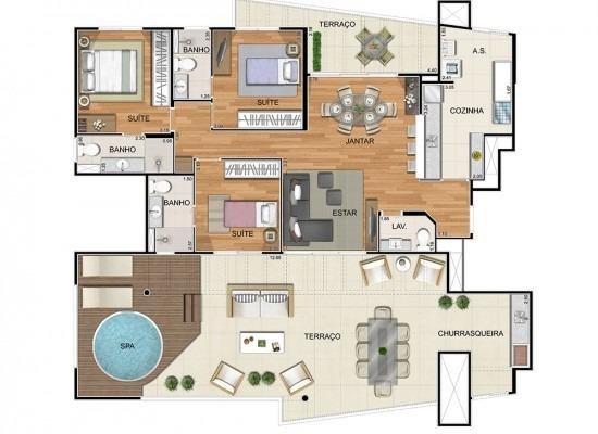 – Cobertura (penthouse) com 3 suítes, 187,70m² privativos e 3 vagas