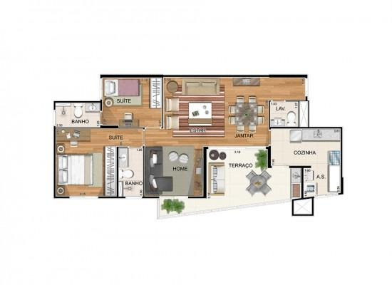 – 2 suítes, 94,32m² privativos e 2 vagas. (Opção home theater)
