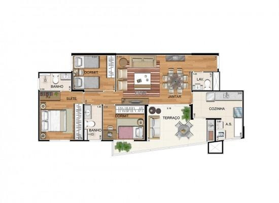 – 3 dormitórios (1 suíte), 94,32m2 privativos e 2 vagas ou