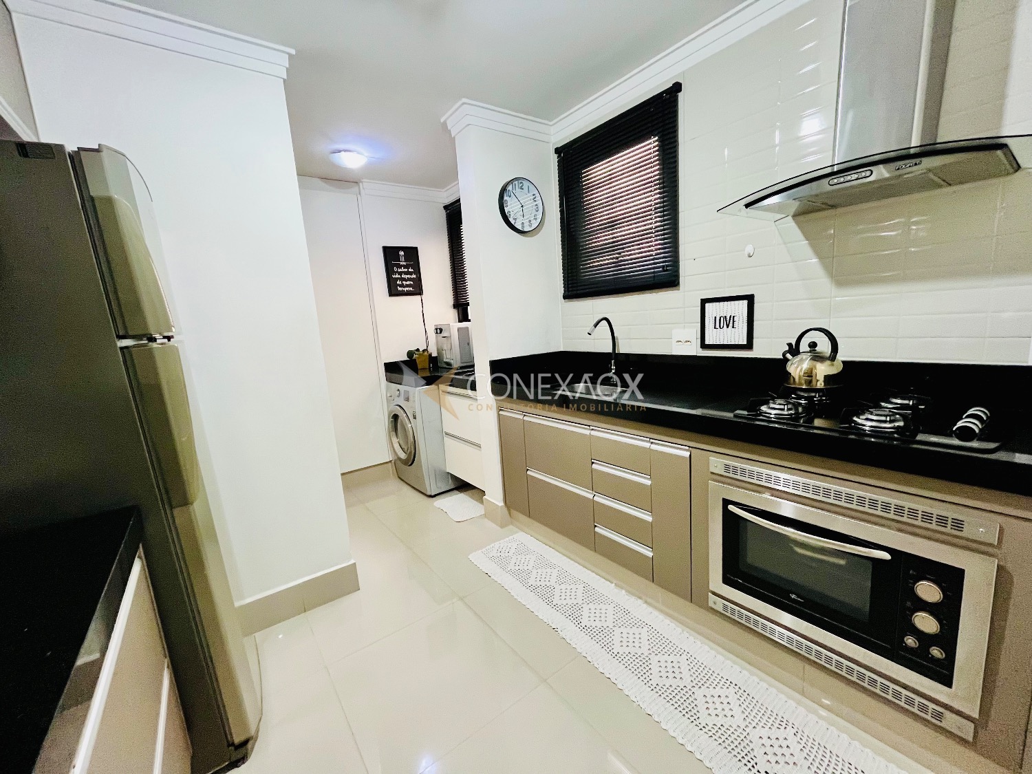 Cozinha moderna equipada com cooktop, forno e coifa, área de serviço com muito espaço para armazenamento e sapateira.