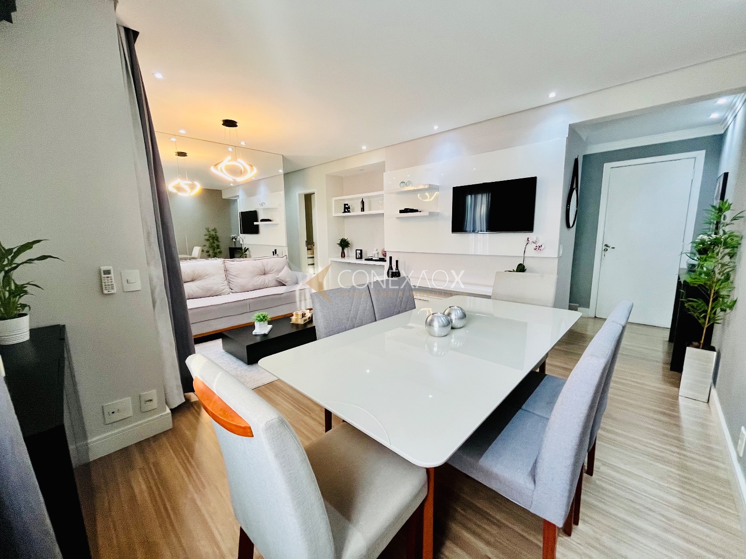 Sala de estar integrada com sala de jantar, charmoso espelho cobrindo toda a parede de entrada, ar condicionado LG inverter quente e frio espelhado, painel e espaço de home office completam o espaço. Andar alto e sacada com vista deslumbrante da área interna do condomínio.