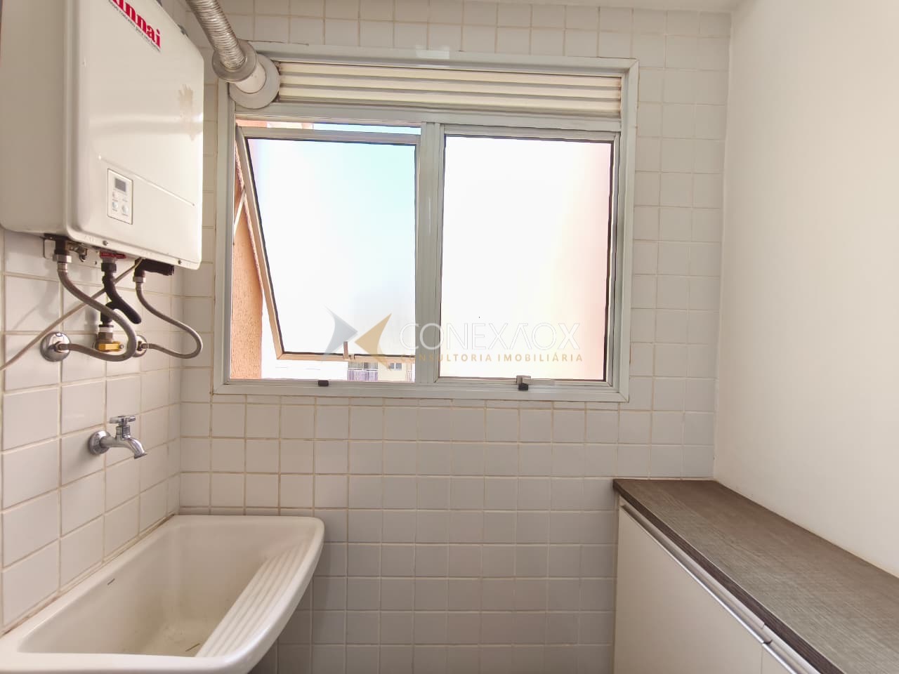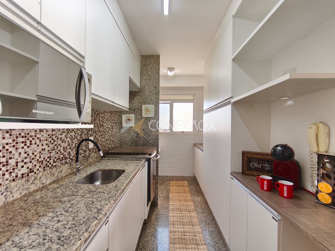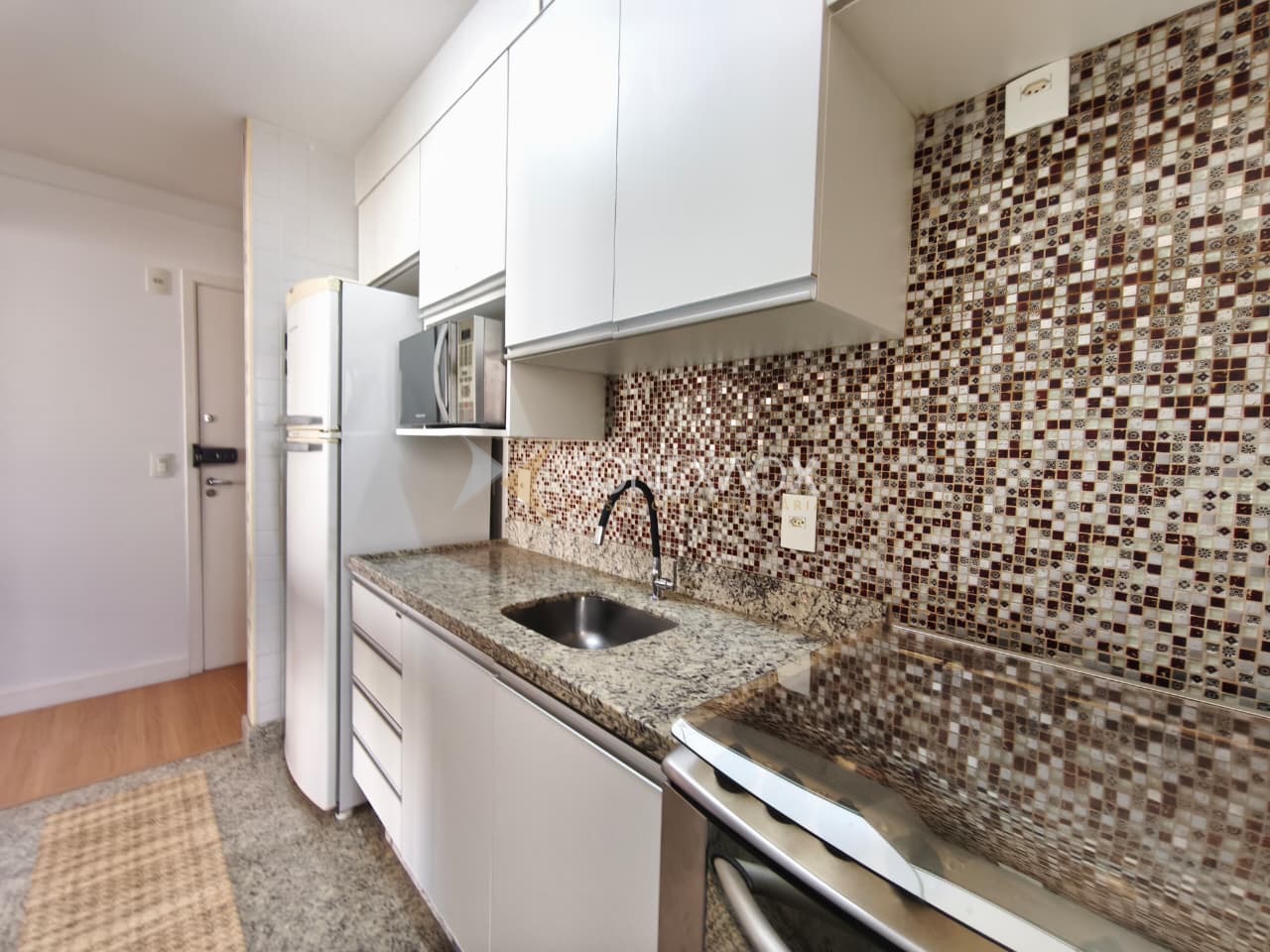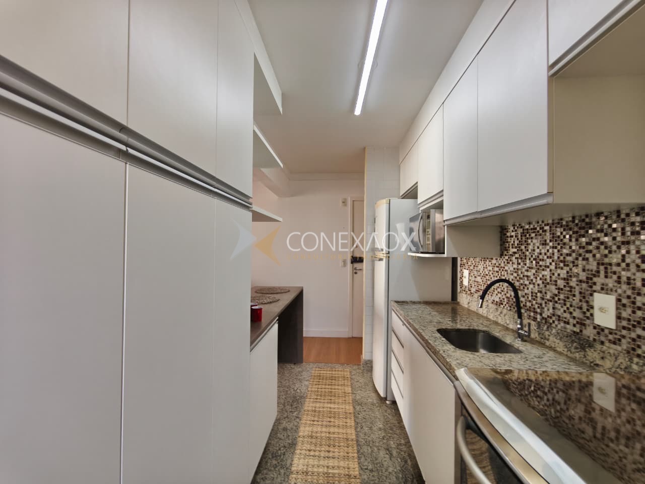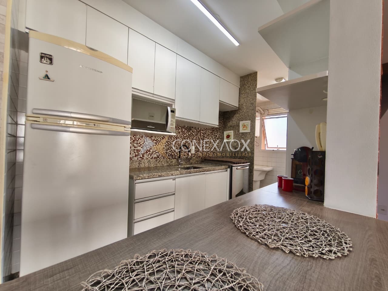 A cozinha é rica em armários e já está equipada com geladeira, microondas e fogão.