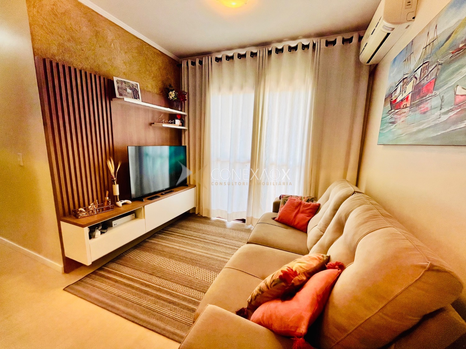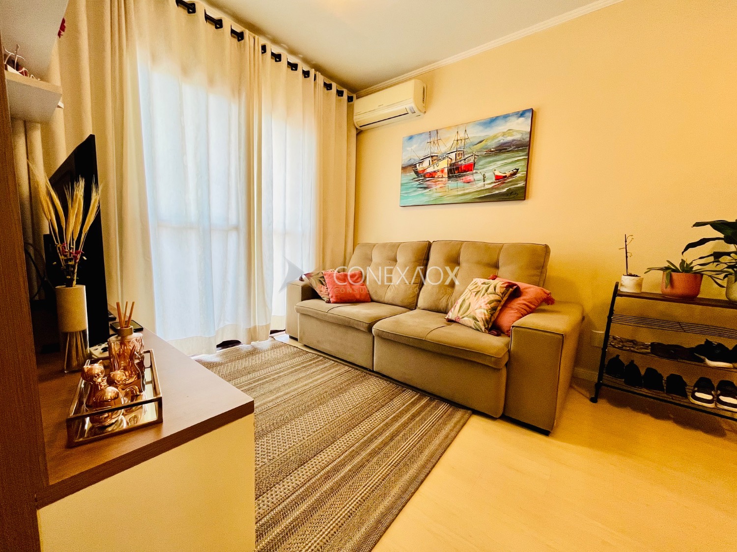 Sala de jantar e estar integradas, charmosa varanda, ar condicionado para refrescar os dias quentes e sol da manhã.