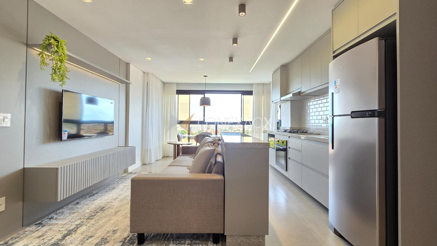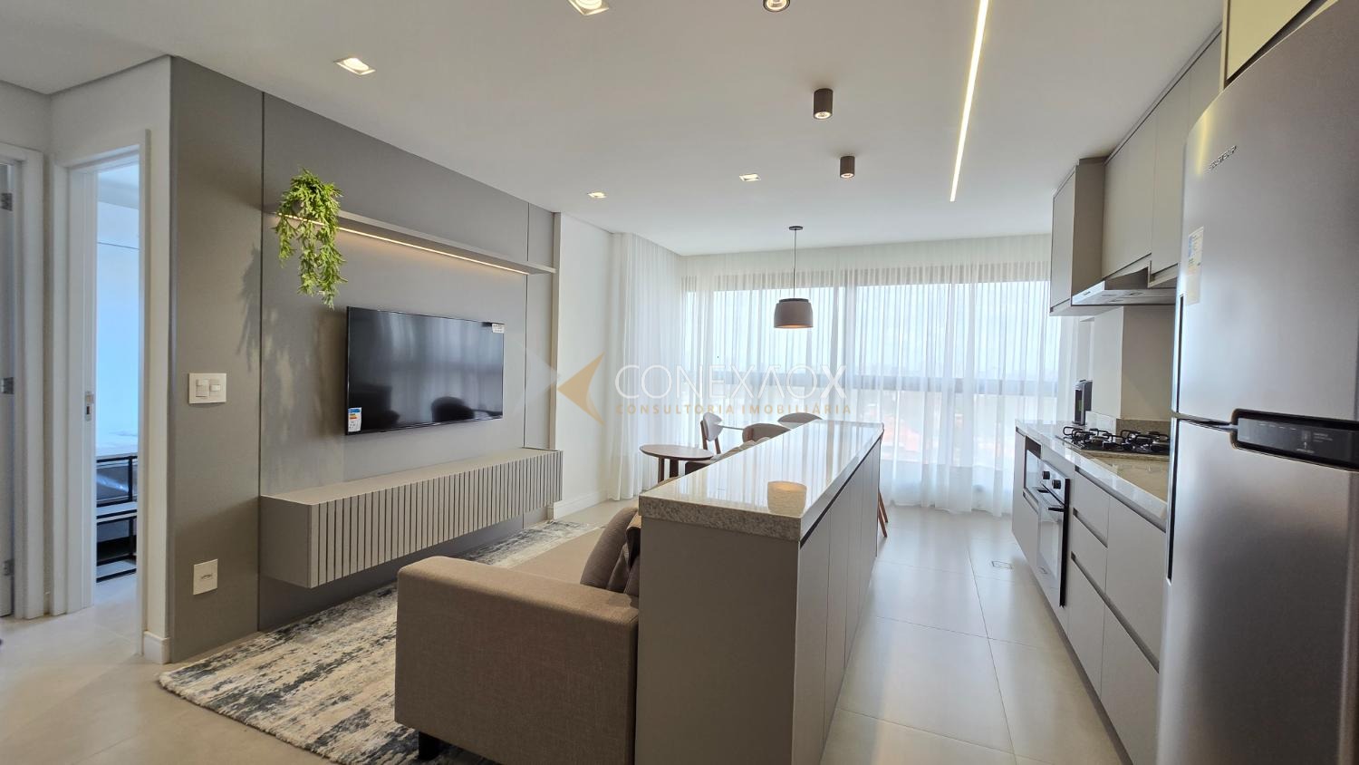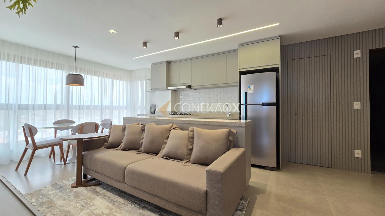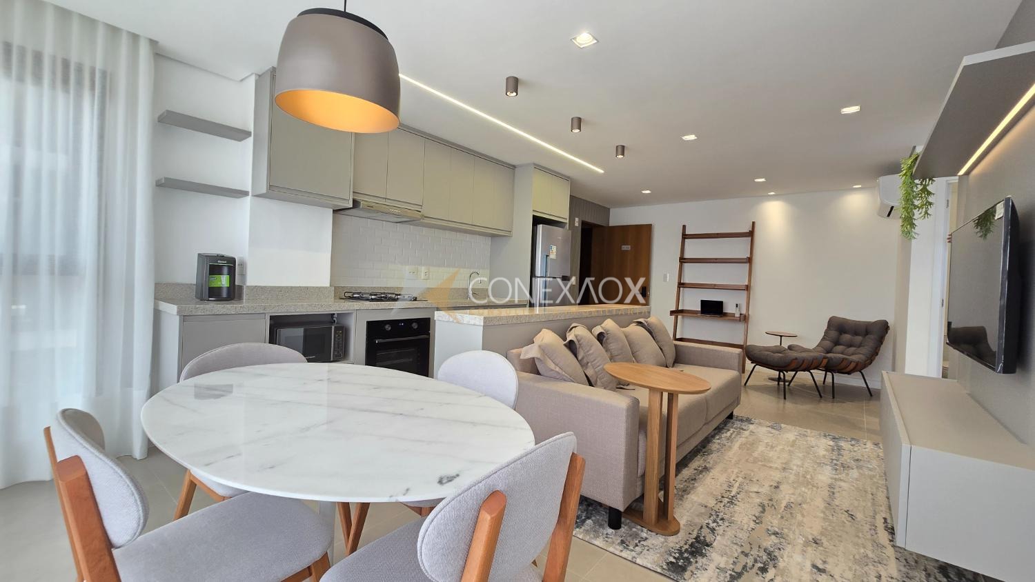 Apartamento novo, mobiliado, para alugar no Nova Campinas. Sala de estar com TV, sala de jantar, espaço para leitura, cozinha planejada, com cooktop,forno, geladeira e filtro de água, área de serviço com máquina de lavar,lavabo, 02 quartos suítes com camas, armários e persianas automatizadas. Ar condicionado na sala e quartos. 02 vagas de garagem no subsolo.