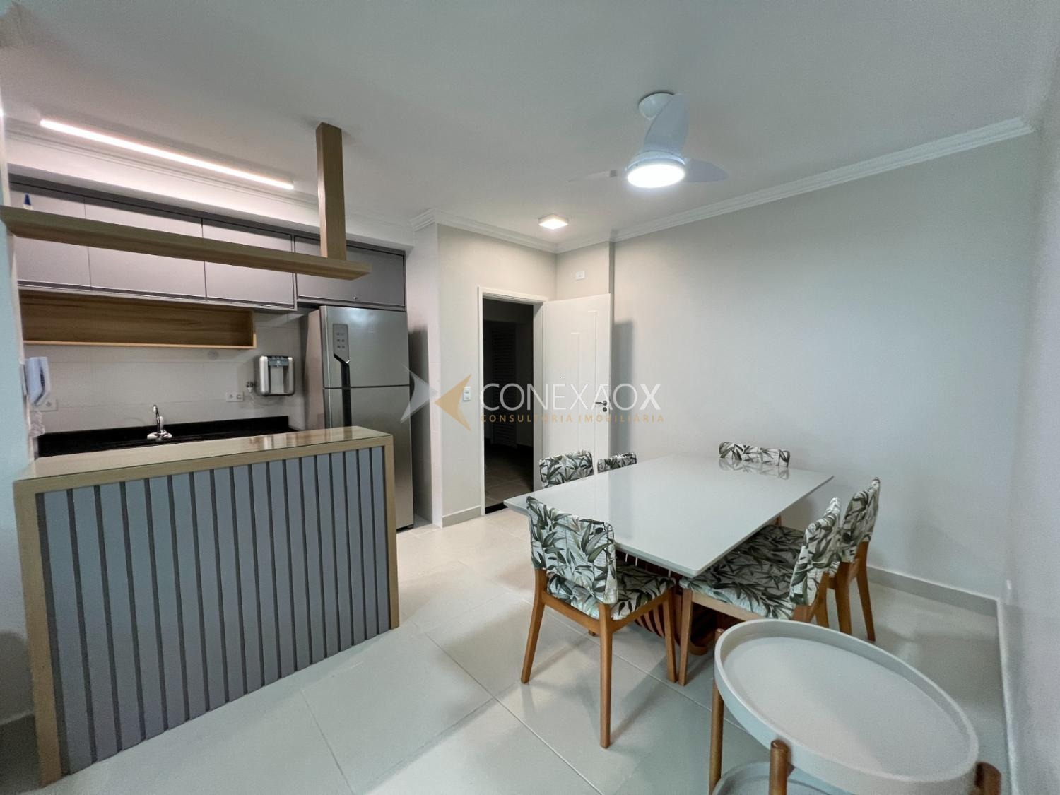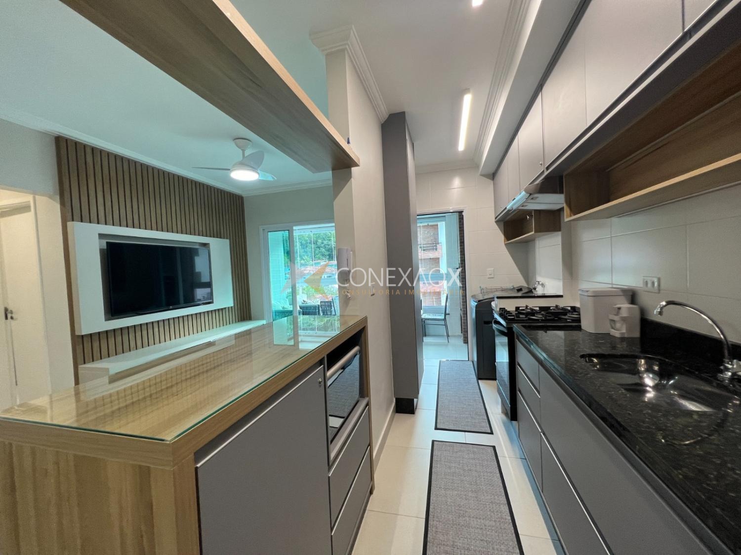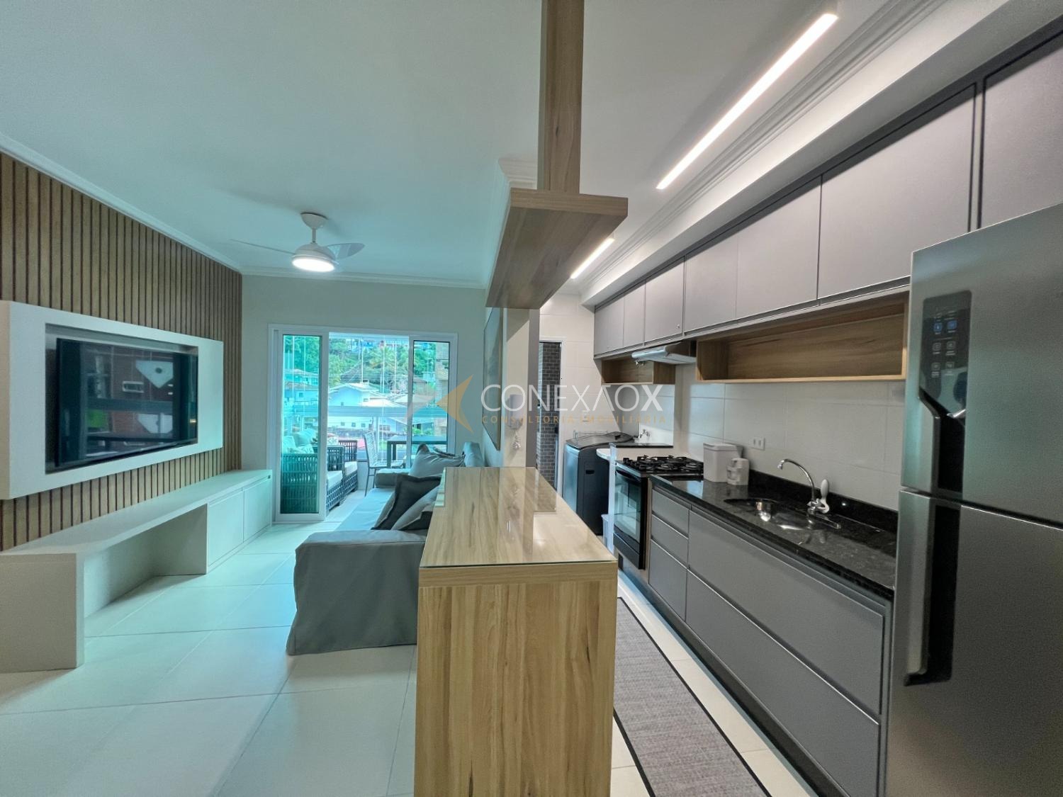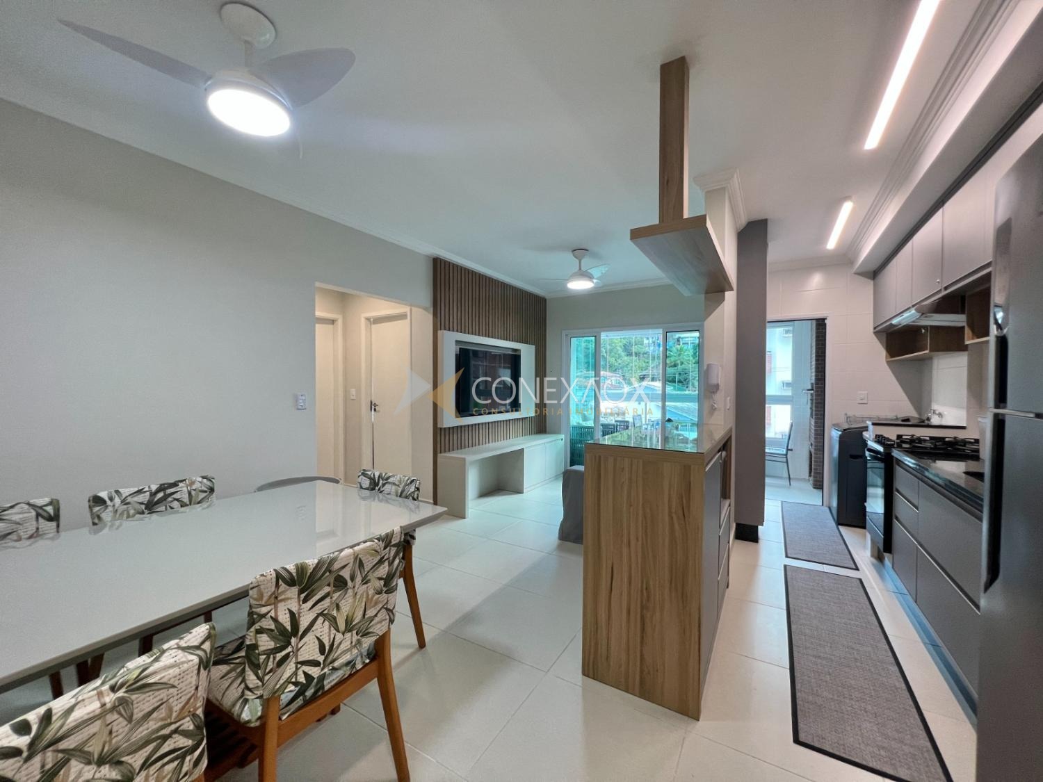 A cozinha americana é completa, equipada com fogão, forno, micro-ondas, coifa e geladeira, integrada à sala de jantar, que dispõe de mesa para seis lugares. A sala de estar é aconchegante, com TV, sofá-cama e integração com a sacada gourmet, que conta com churrasqueira, mesa, cadeiras, fechamento em vidro e cortinas com persiana, além de vista para a mata, trazendo privacidade e contato com a natureza.