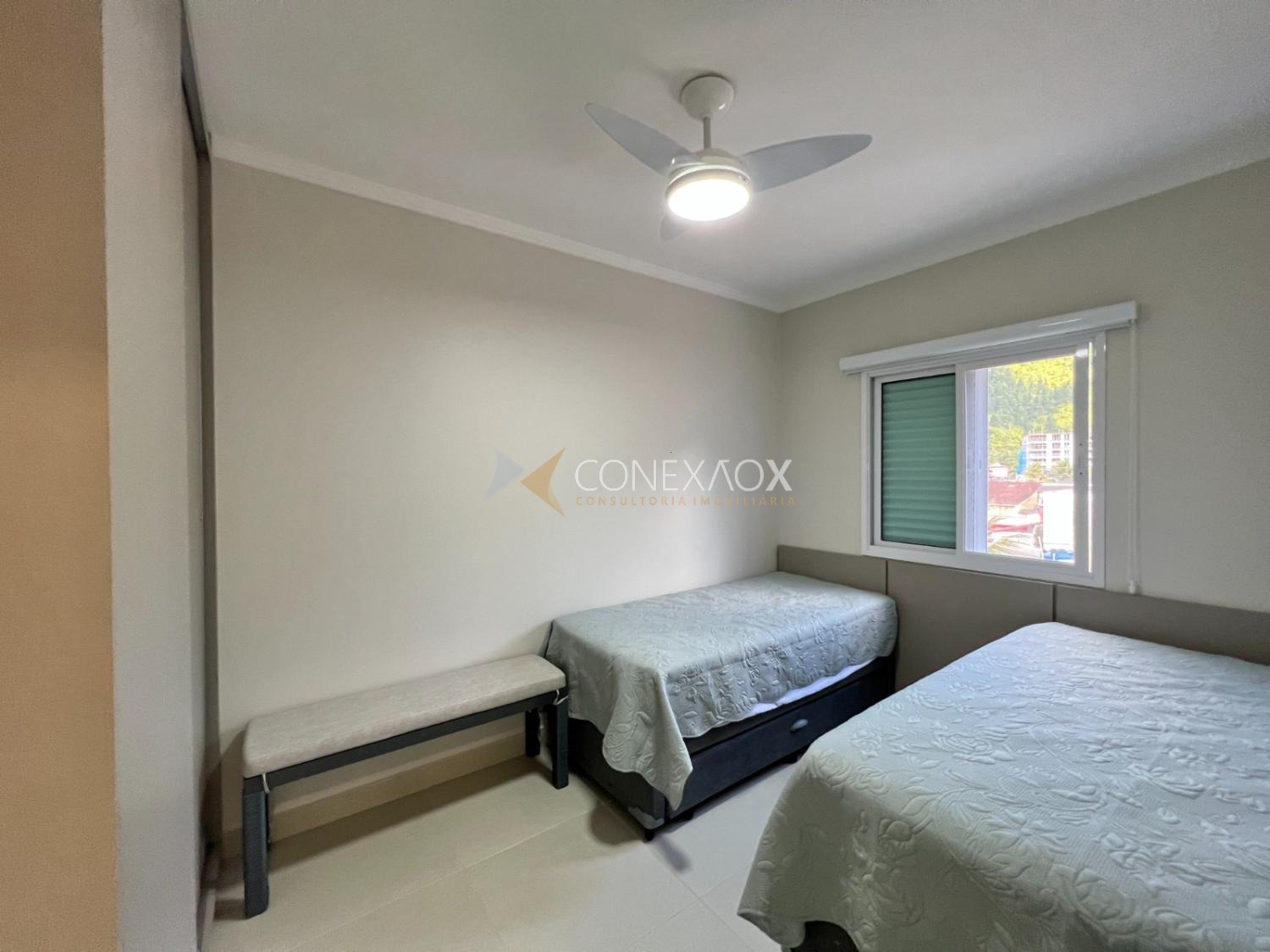 O imóvel possui 2 dormitórios, sendo 1 suíte, ambos com ar-condicionado, ventiladores, camas, armários planejados e excelente ventilação natural. A suíte conta ainda com cama de casal e TV. O banheiro social atende perfeitamente ao segundo dormitório e à área social.