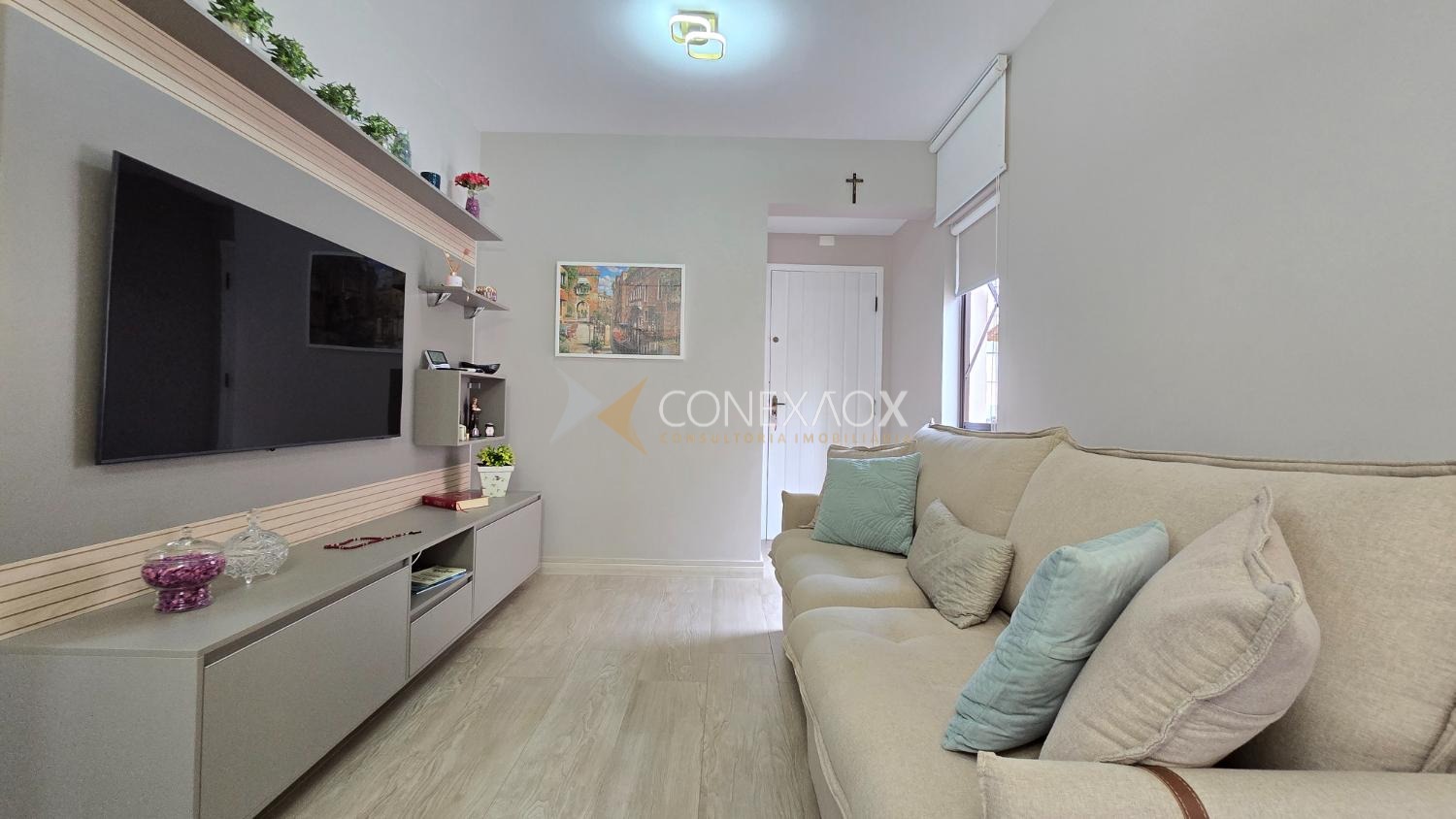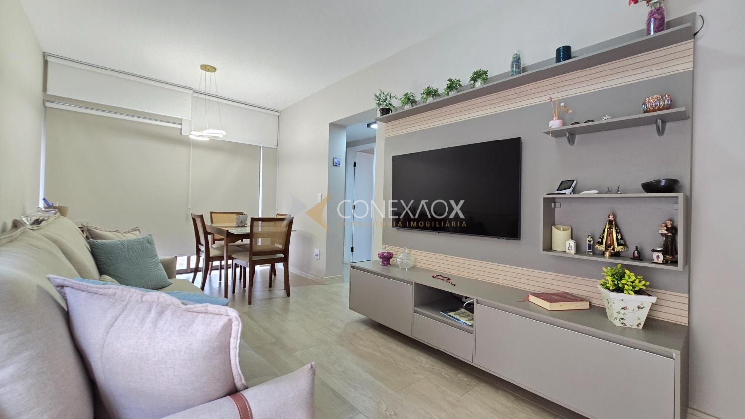 Com 52,96 m² de área útil, este apartamento se destaca pelo ambiente acolhedor, bem distribuído e pronto para morar. A sala de estar conta com painel e sofá de 3 lugares, integrada à sala de jantar com mesa para 4 pessoas, criando um espaço funcional e confortável.