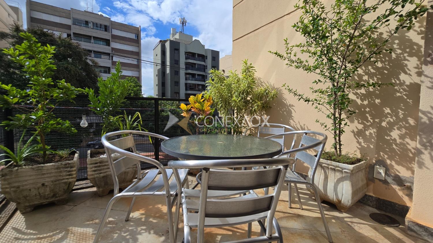 A varanda ampla e agradável, já mobiliada e decorada com plantas, oferece ótima ventilação e iluminação natural, além de uma vista urbana arborizada, ideal para momentos de descanso ou refeições ao ar livre.