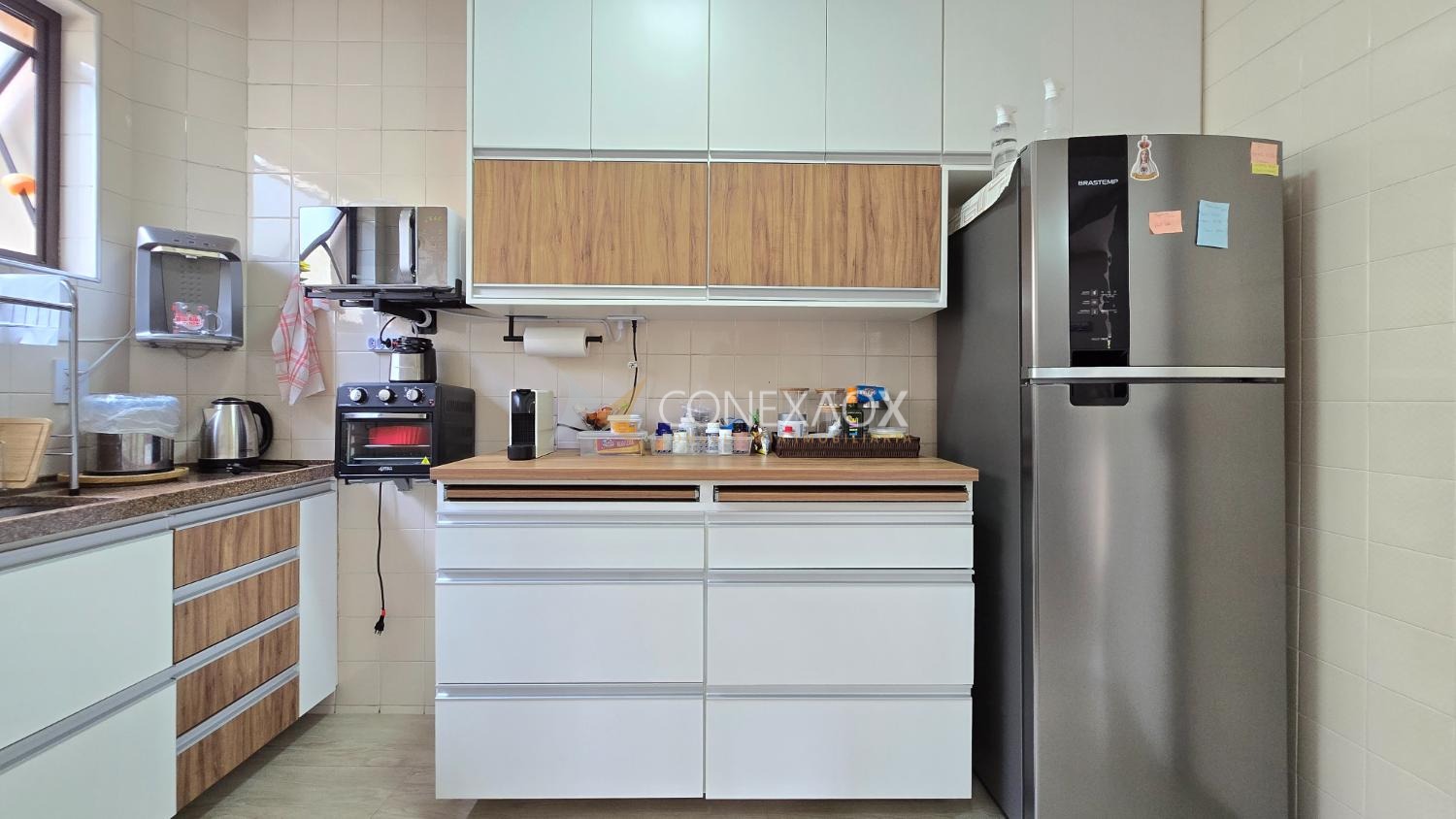 O imóvel dispõe de 01 quarto com armários planejados e cama, infraestrutura pronta para ar condicionado, cozinha equipada com armários planejados, fogão e geladeira, área de serviço e 01 vaga de garagem no subsolo.