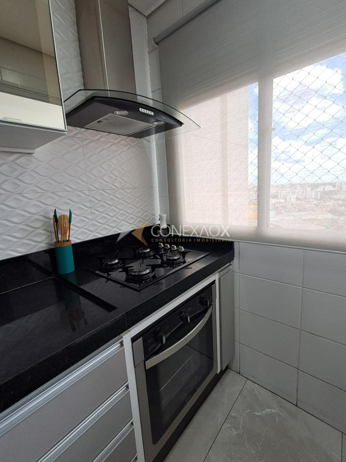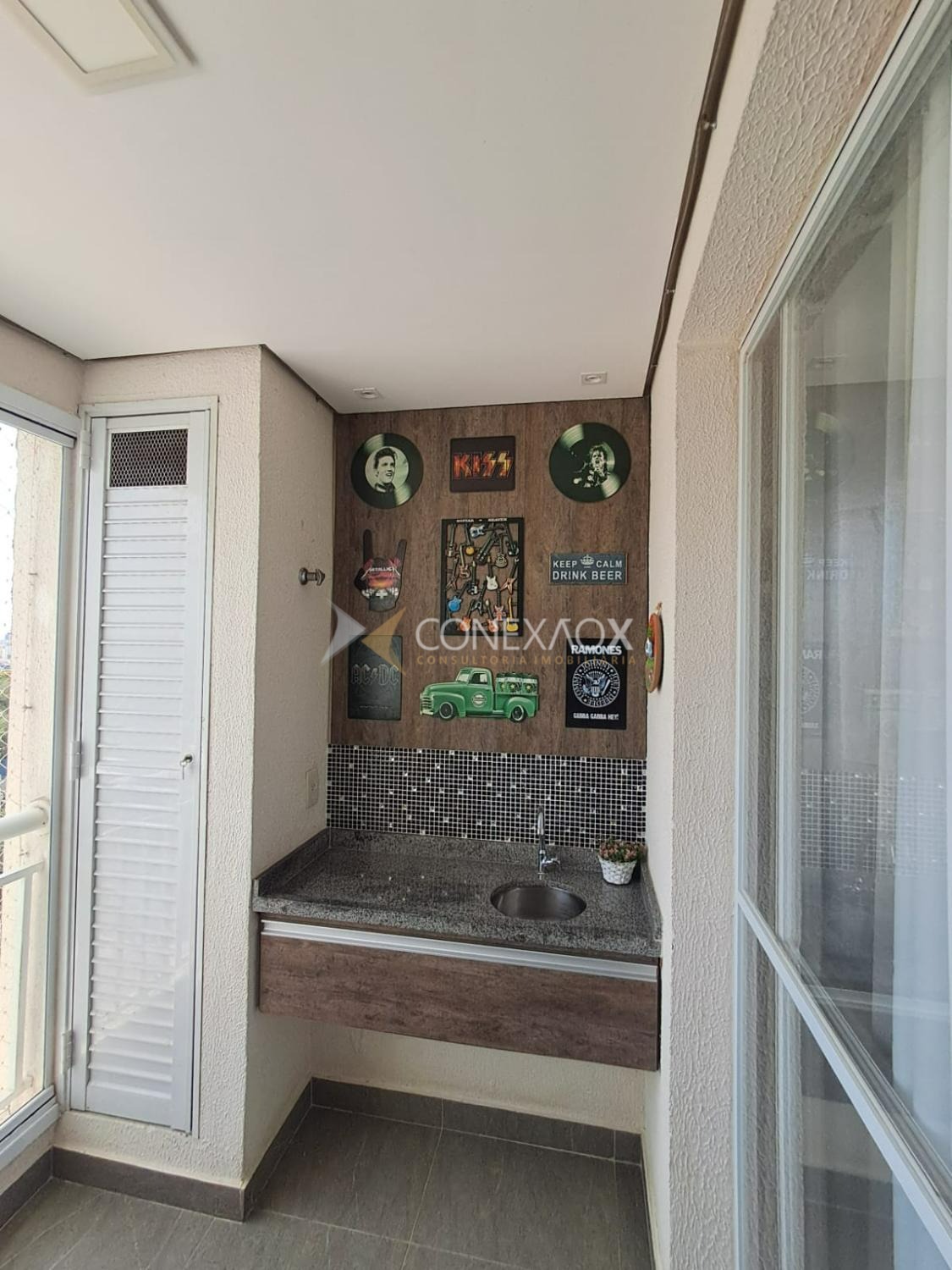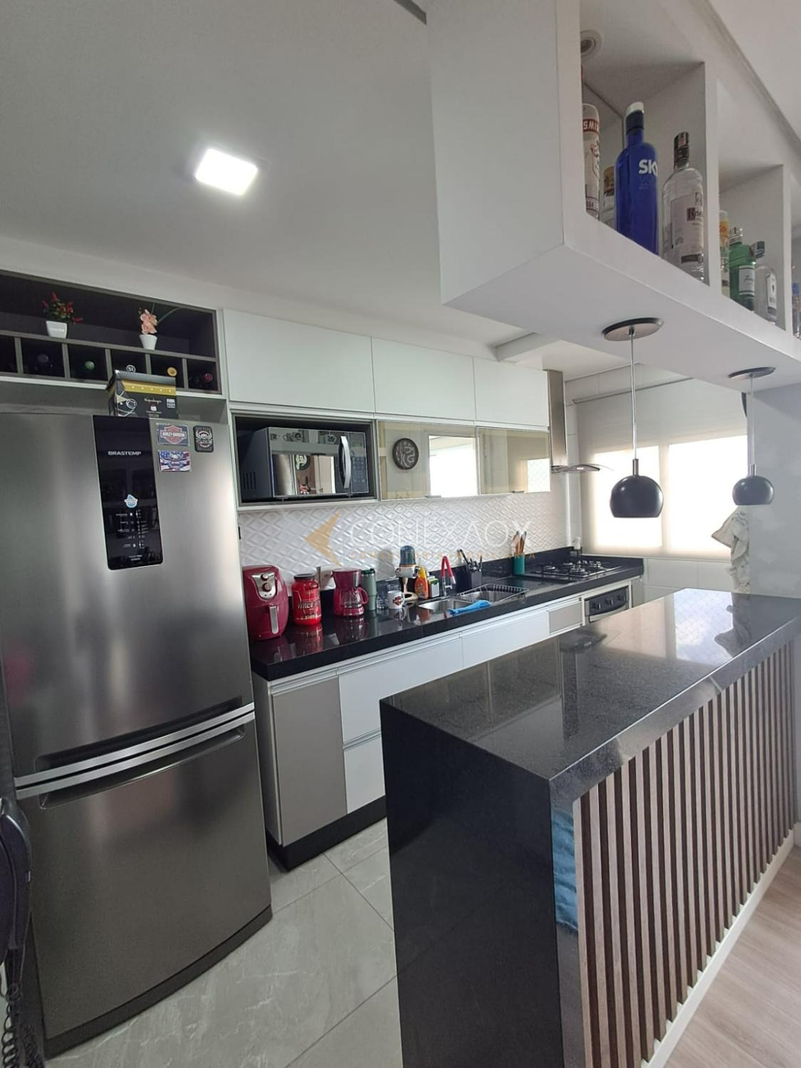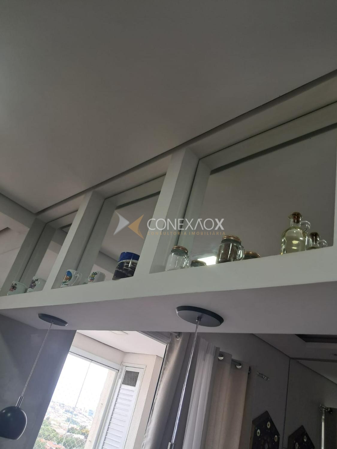 living 3 ambientes integrado a cozinha americana com balcão, varanda com fechamento em vidro. Área se serviço com fechamento em porta de vidro.