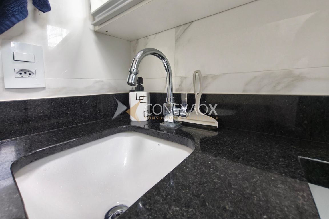 O apartamento está todo reformado, com piso em porcelanato, bancadas em mármore e móveis planejados, oferecendo um ambiente moderno e funcional.