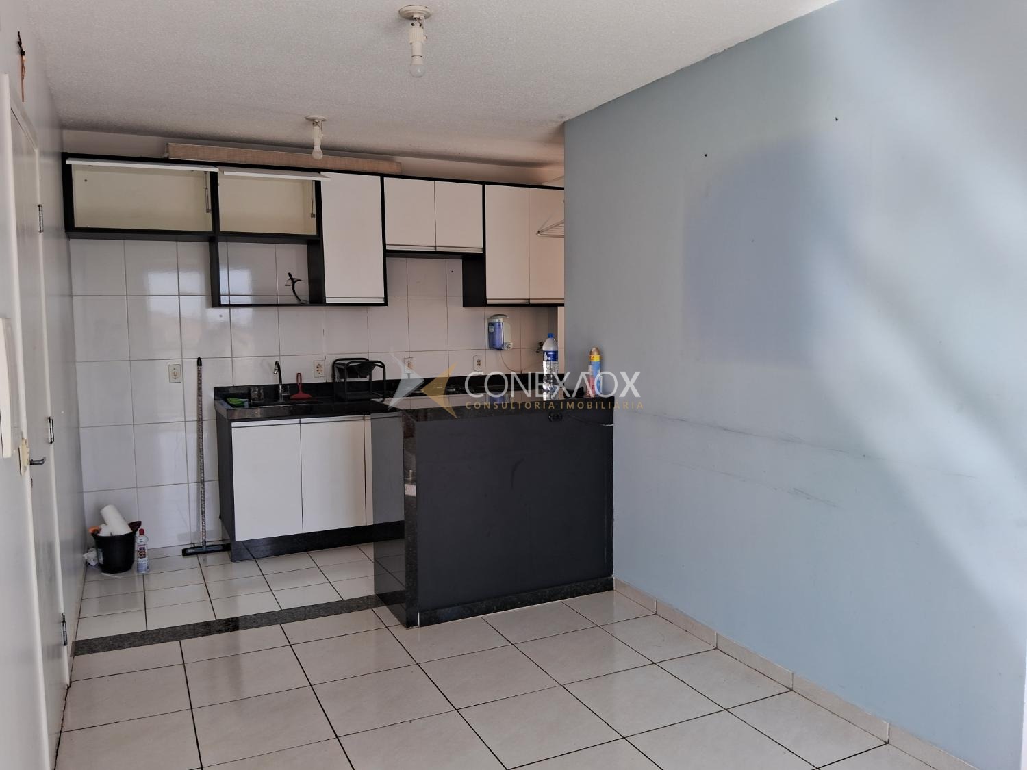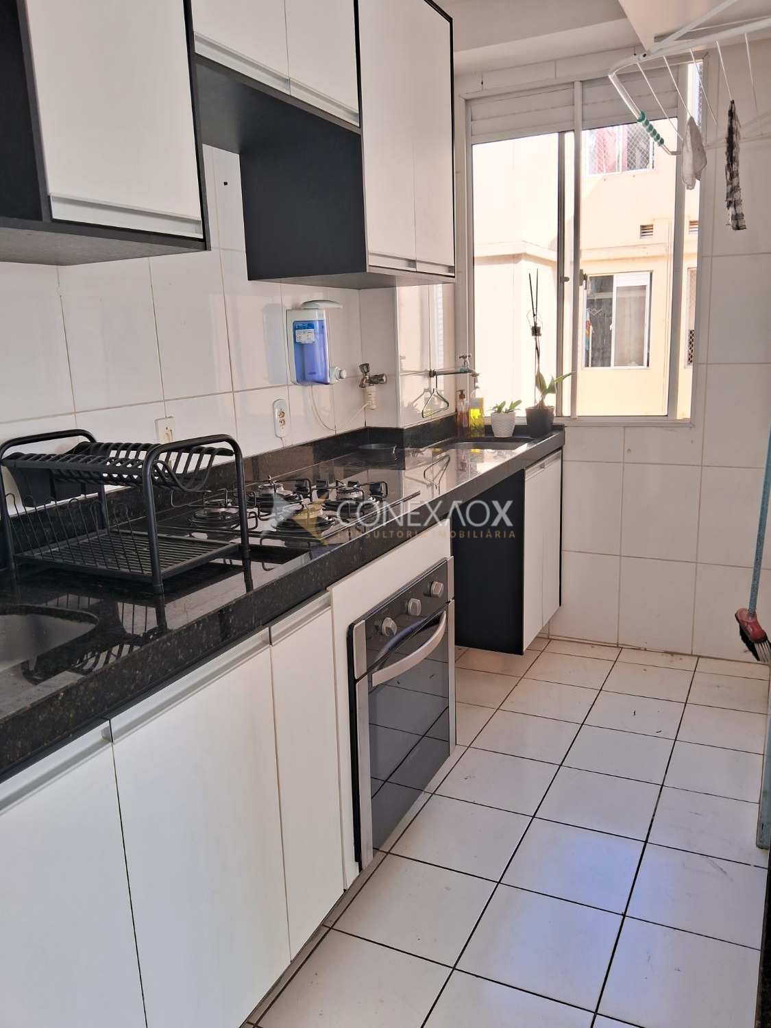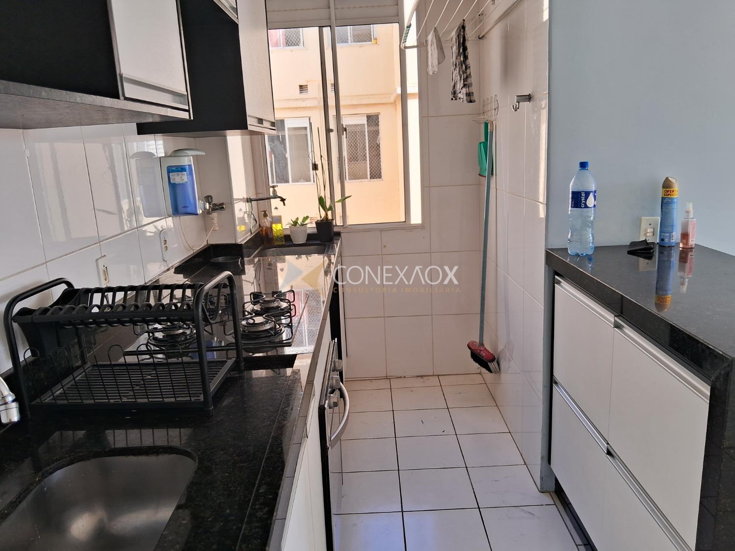 Sala para dois ambientes com sacada, dois quartos, banheiro com gabinete e box blindex, cozinha americana planejada e equipada com cooktop e forno, área de serviço, todo em piso cerâmica, uma vaga de garagem coberta. Portaria 24 horas, lazer com salão de festa gourmet com churrasqueira, quadra , playground e mini mercado para comodidade dos moradores. Documentos em ordem para financiamento e FGTS.