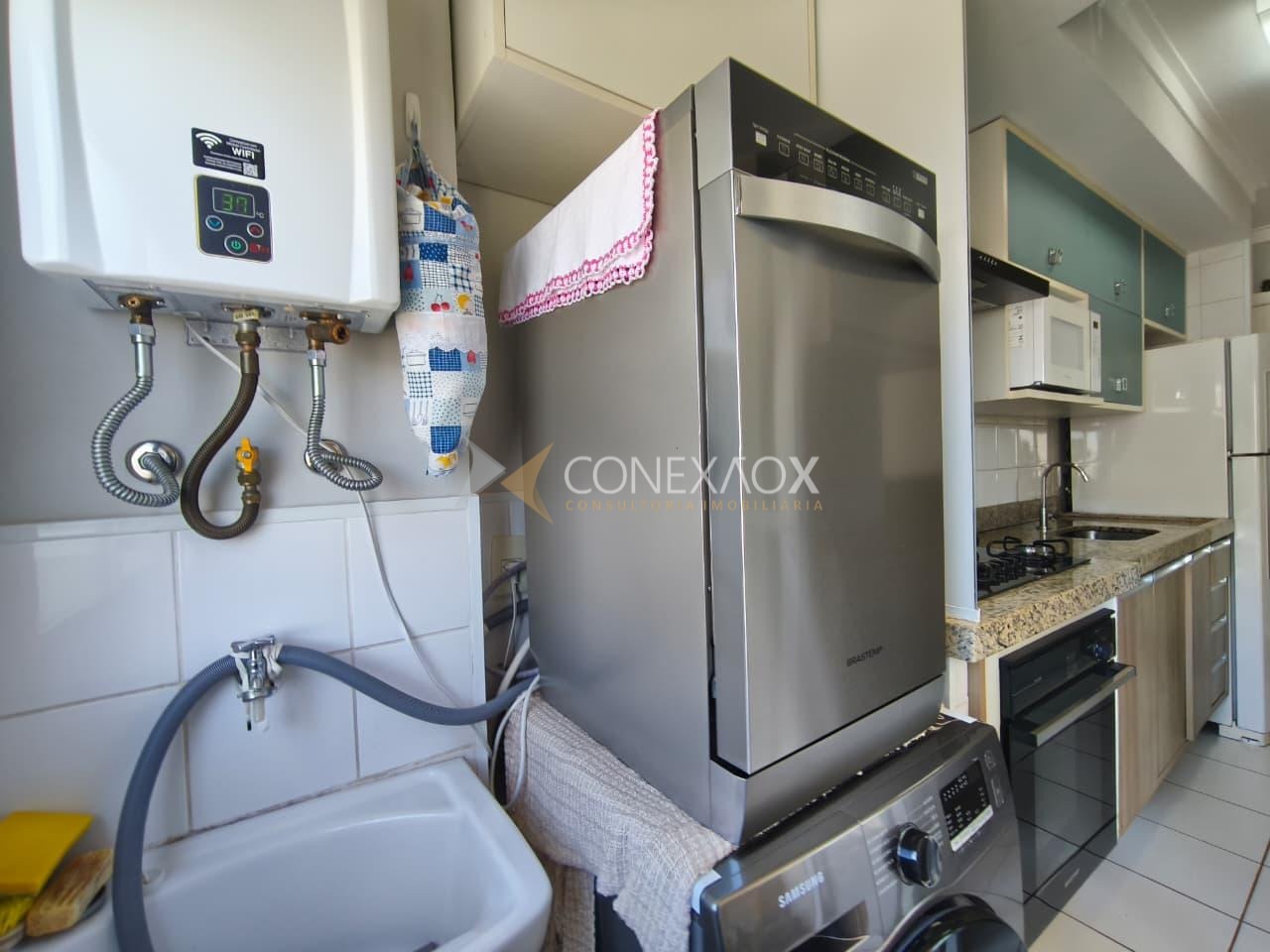 O apartamento dispõe de 2 banheiros, 2 vagas de garagem e diferenciais que elevam o padrão do imóvel, como armários planejados em todos os cômodos, ar-condicionado, aquecimento de água a gás e gás encanado. A sacada conta com fechamento em blindex, agregando conforto e segurança.