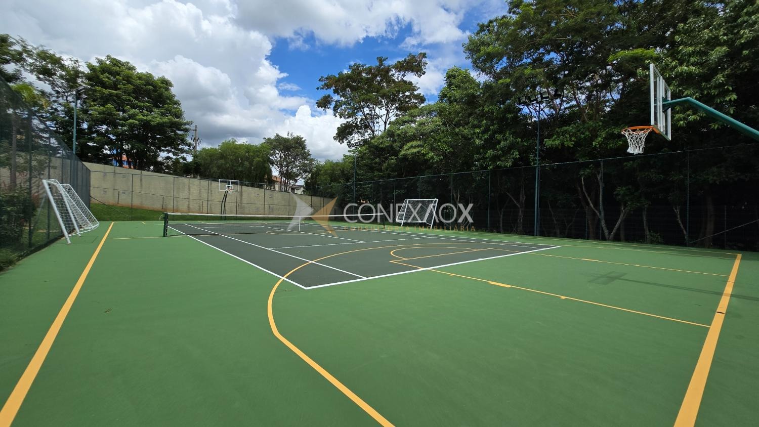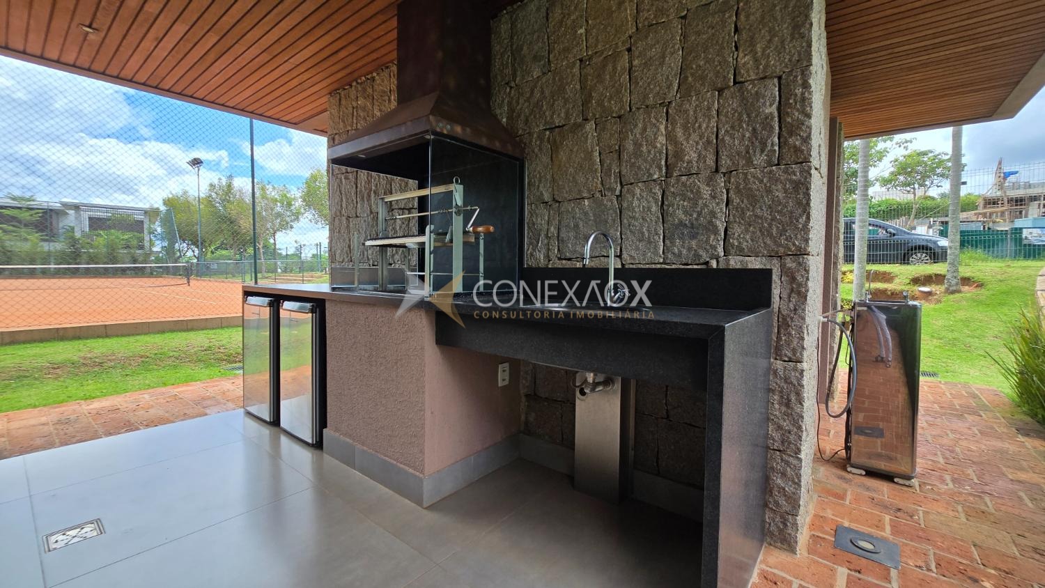 O condomínio oferece infraestrutura completa de lazer e segurança: academia, salão de festas, churrasqueira, quadra de tênis de saibro, beach tennis e poliesportiva, playground e portaria 24 horas.