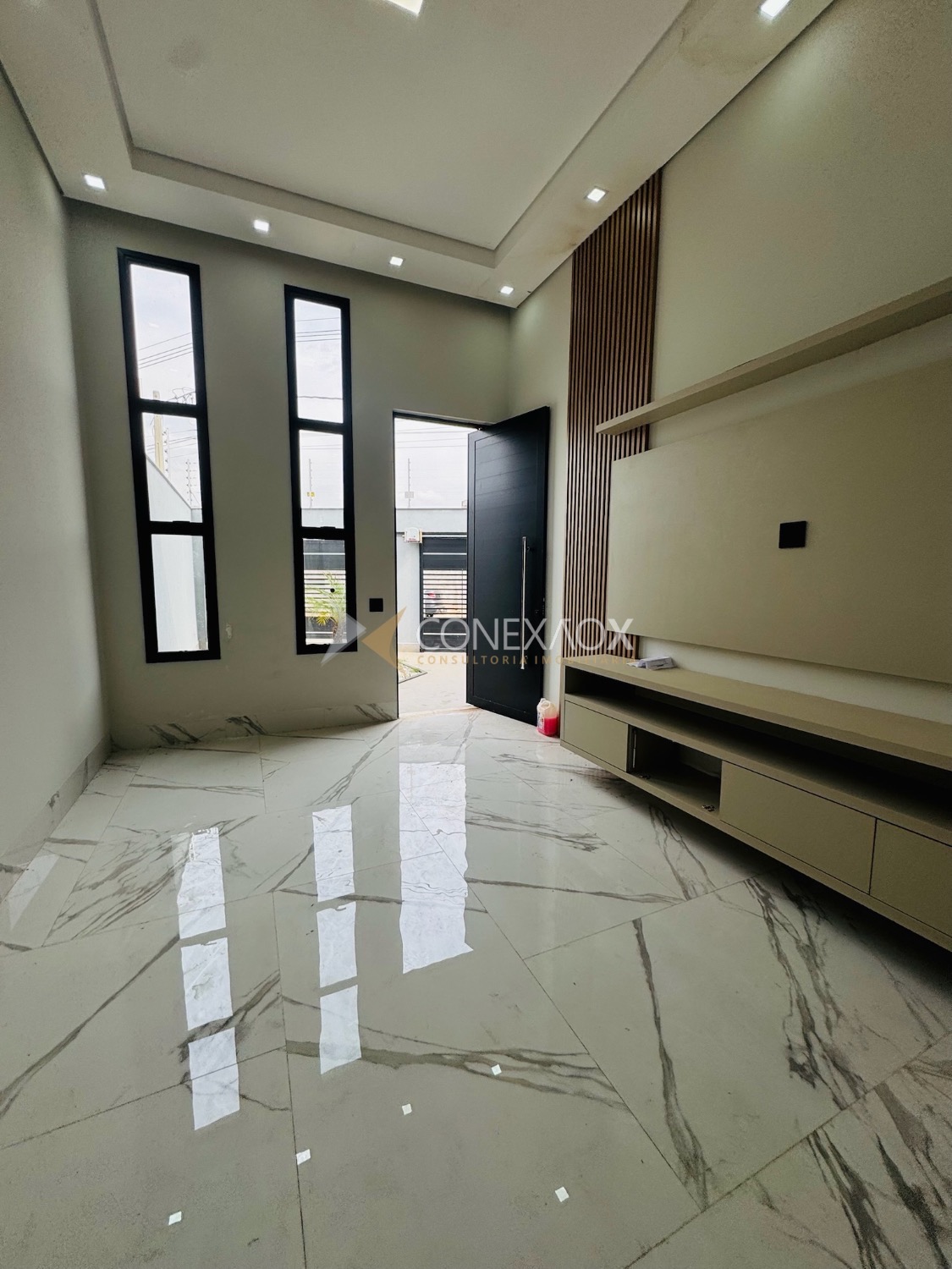 A sala com pé-direito alto integra-se à cozinha gourmet, criando um espaço moderno e aconchegante para reunir amigos e familiares.