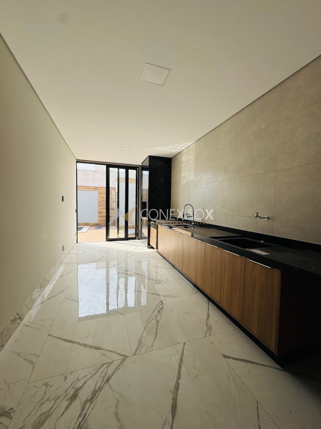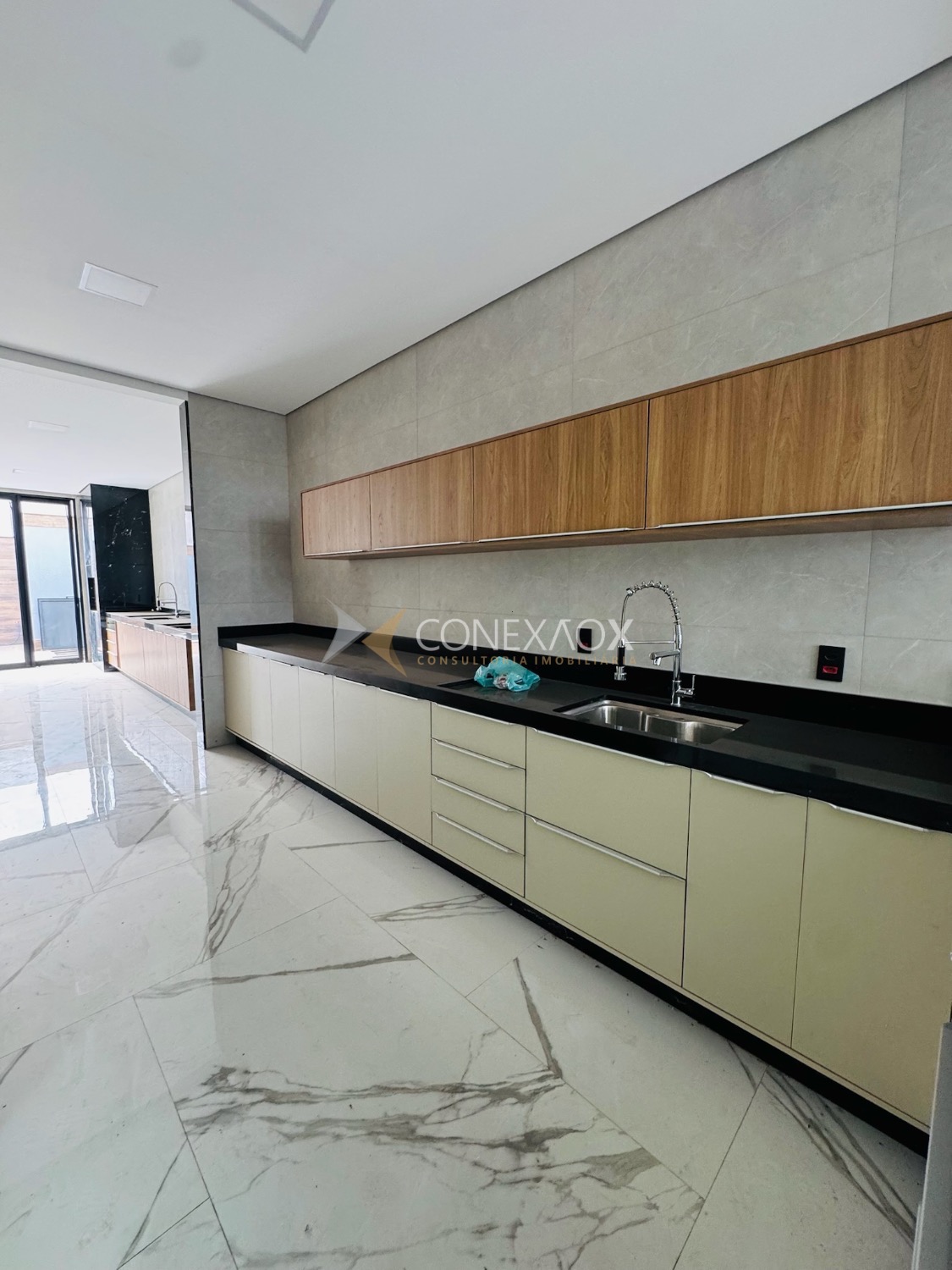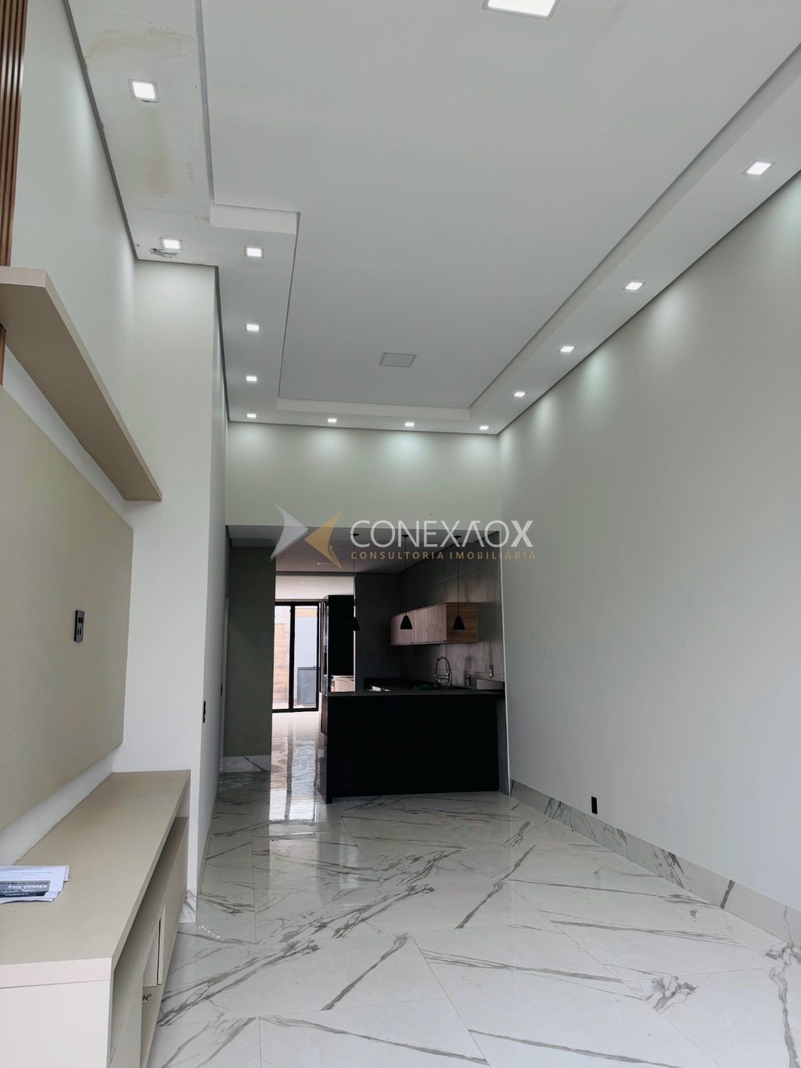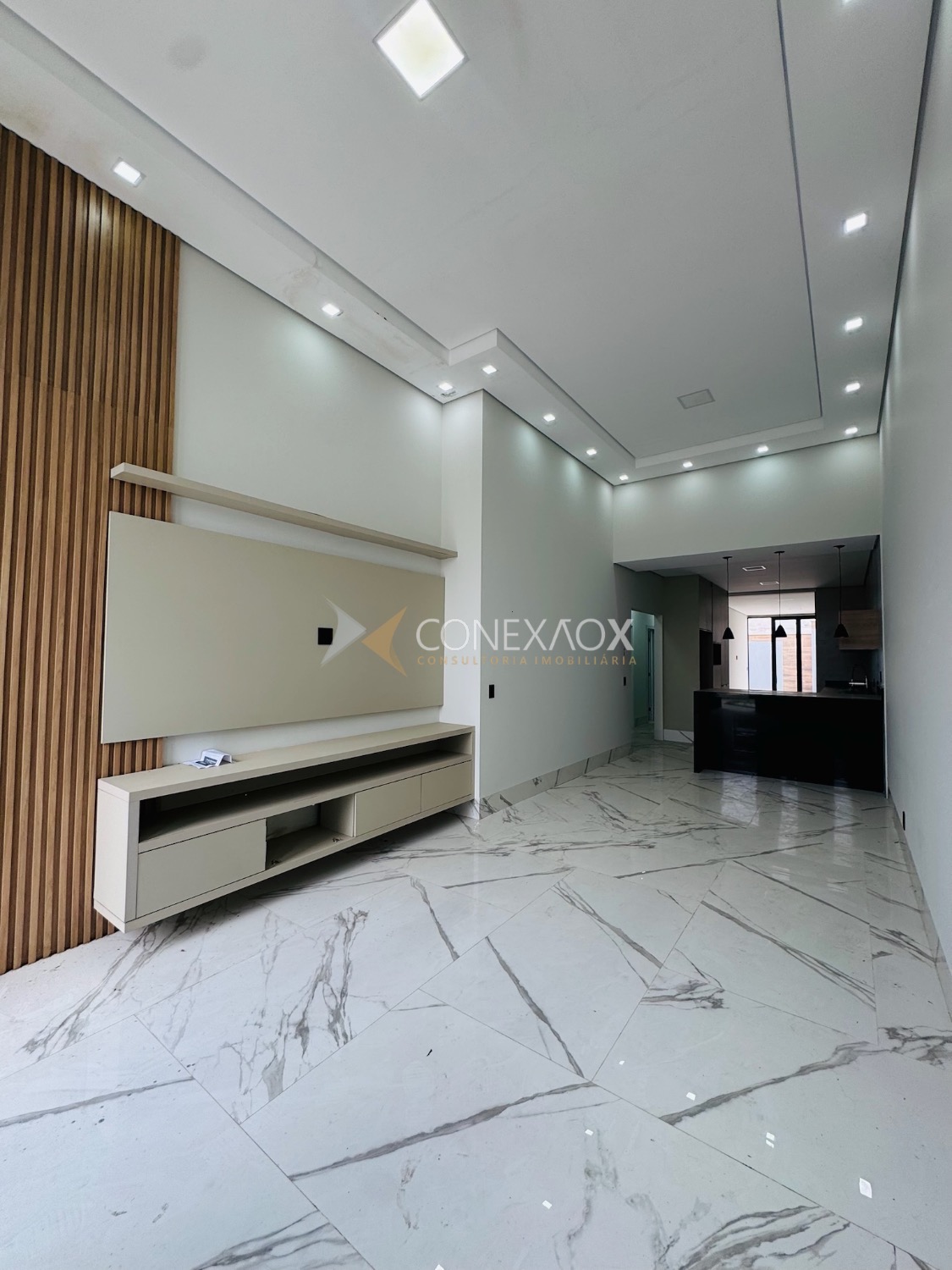 A sala com pé-direito alto integra-se à cozinha gourmet, criando um espaço moderno e aconchegante para reunir amigos e familiares.