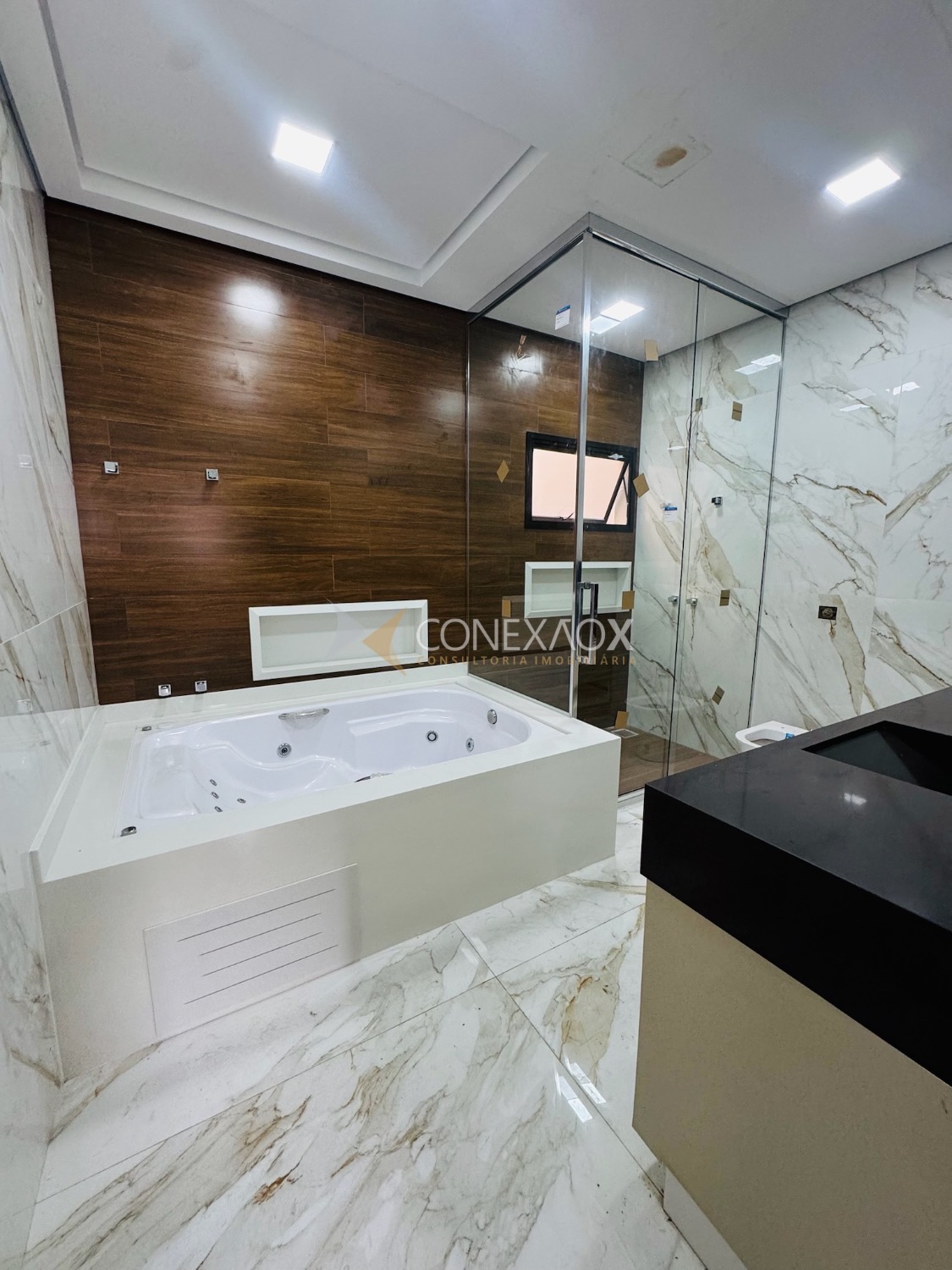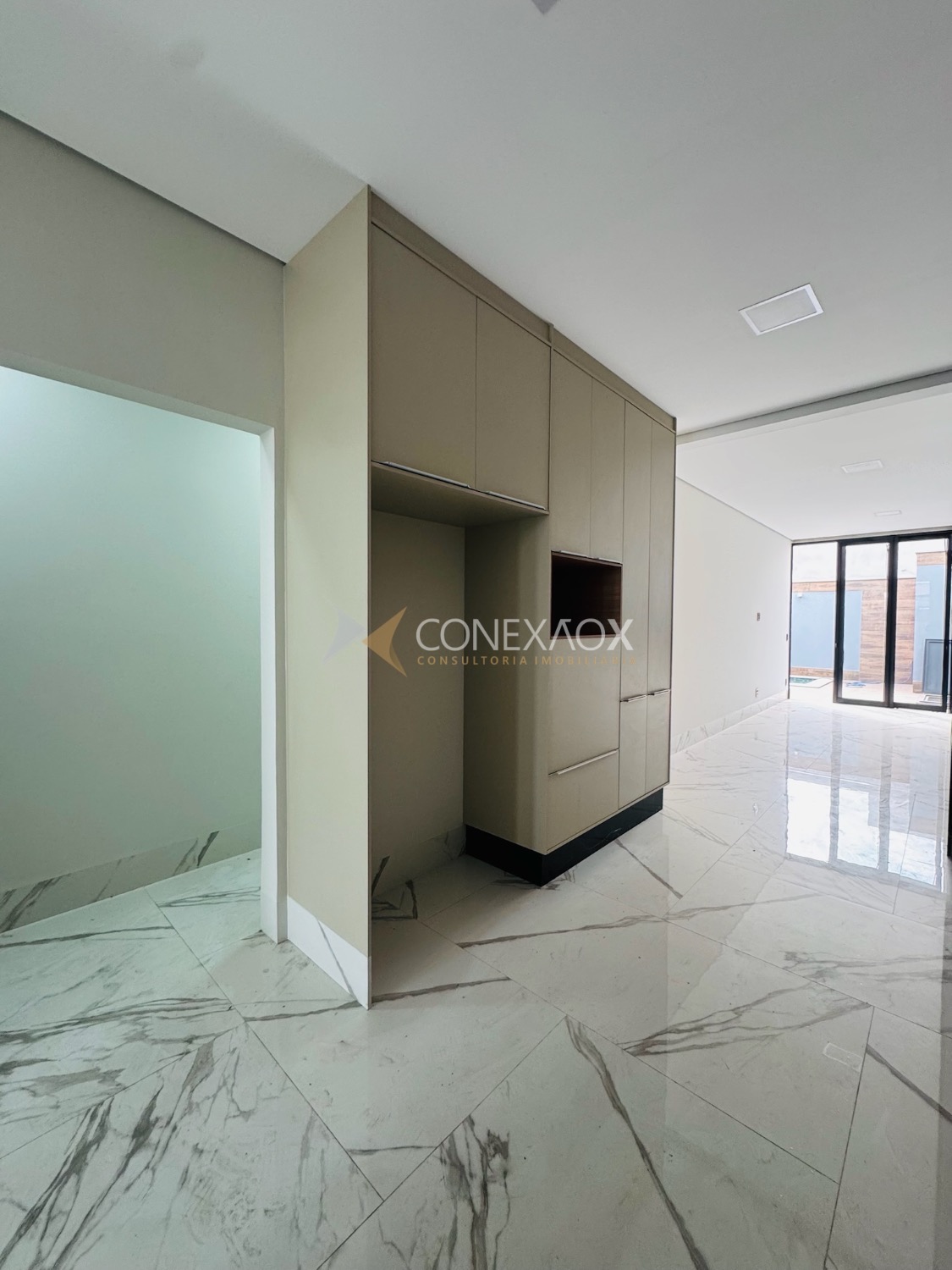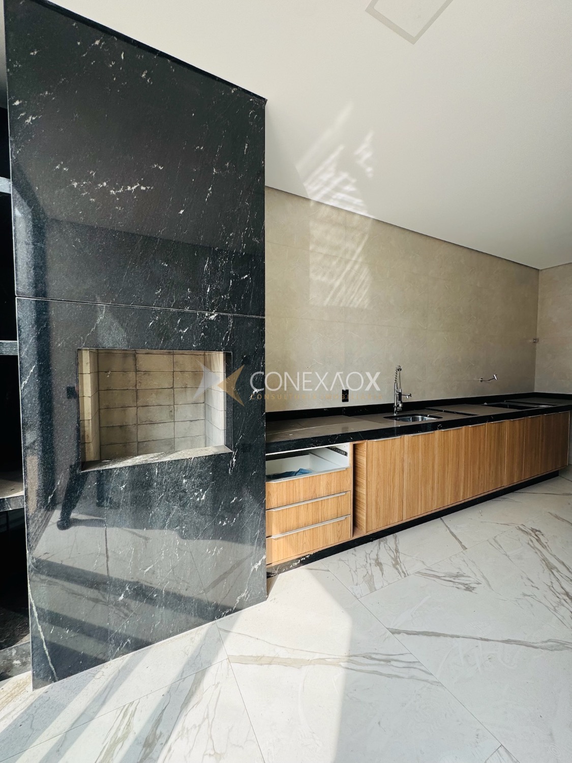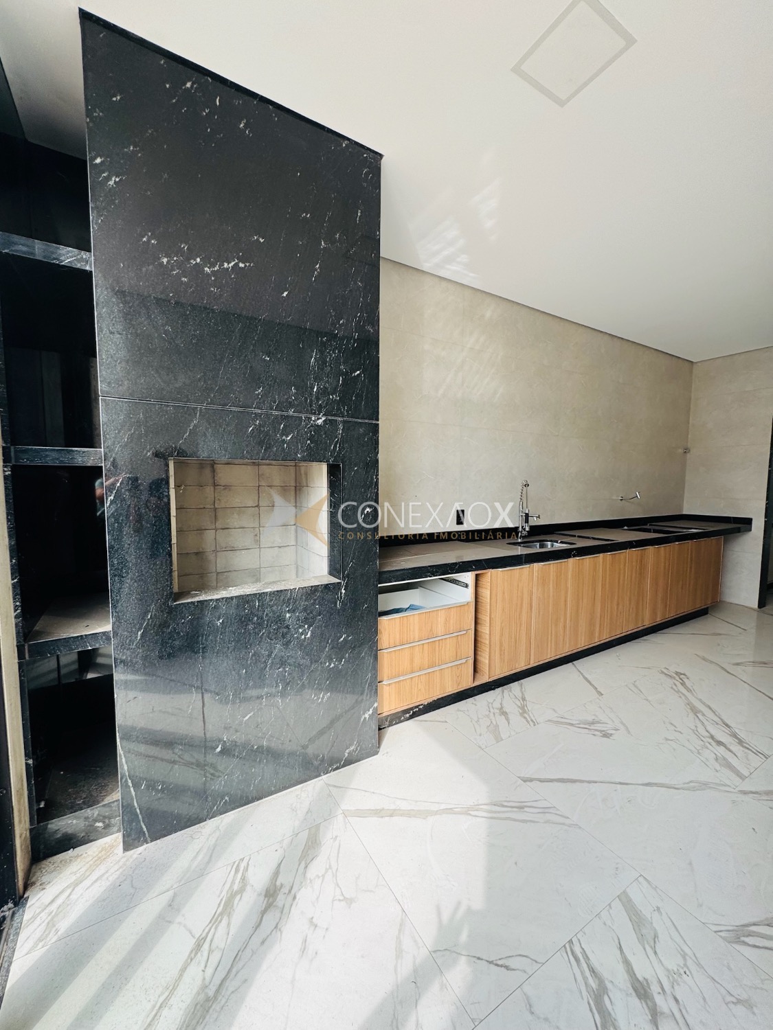 A sala com pé-direito alto integra-se à cozinha gourmet, criando um espaço moderno e aconchegante para reunir amigos e familiares.
