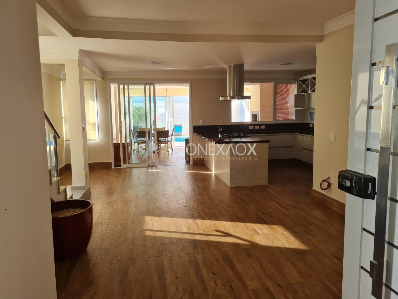 Disposta em dois ambientes (estar e jantar) e conceito aberto, com cozinha estilo americana. Já da sala vemos o espaço da área de lazer, com o quintal a churrasqueira e a piscina aquecida com cascata e hidromassagem.