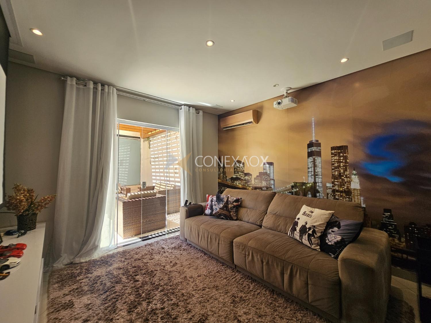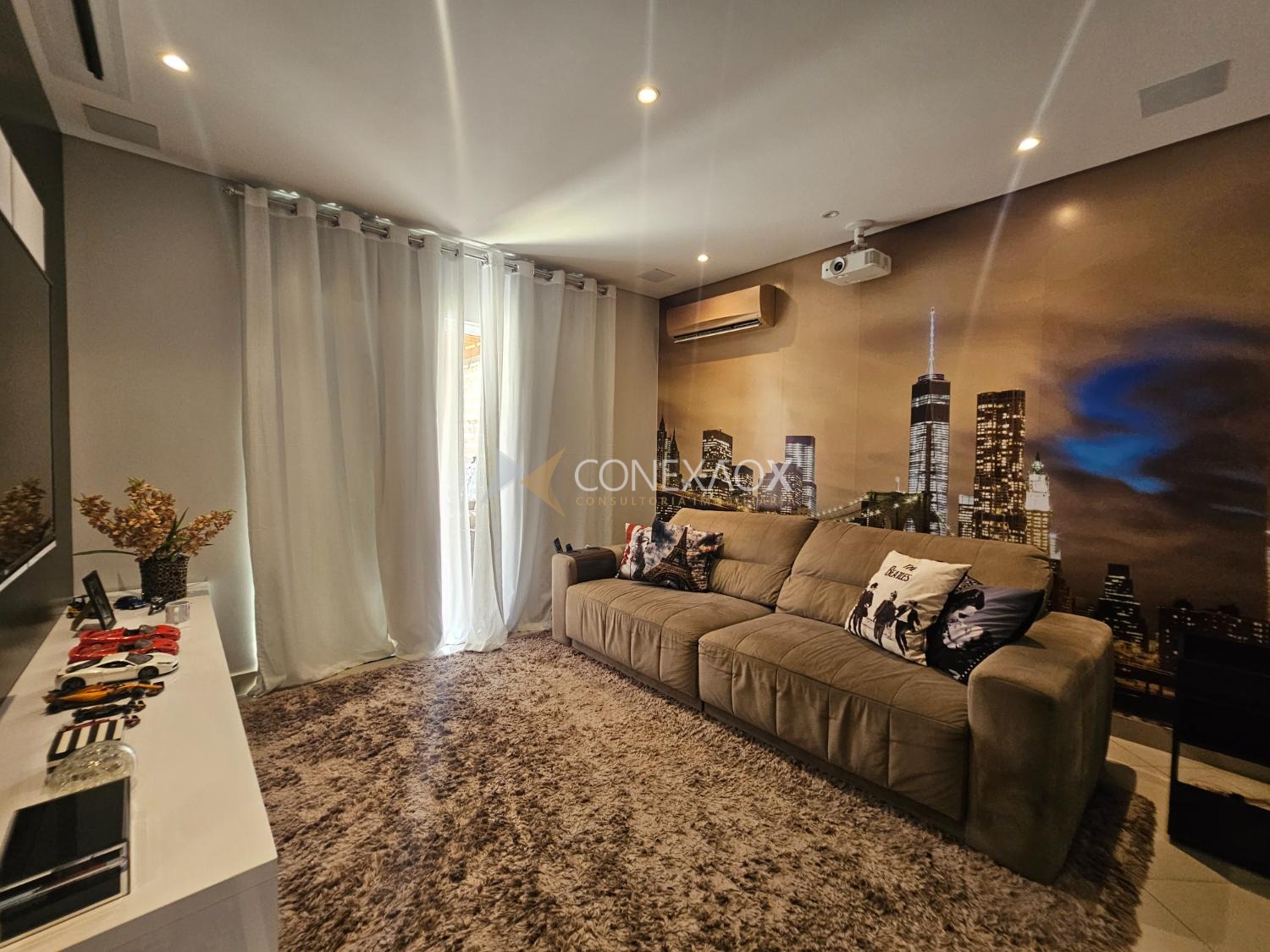 A sala de Tv oferece uma verdadeira experiência de cinema em casa, equipada com Tv, tela de projeção retrátil