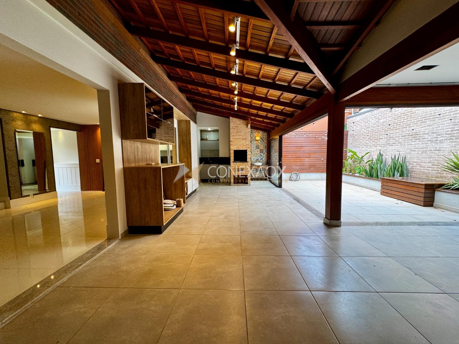 Esses ambientes se conectam harmoniosamente ao espaço gourmet fechado em vidro, equipado com churrasqueira, banheiro de apoio e acesso à área externa.