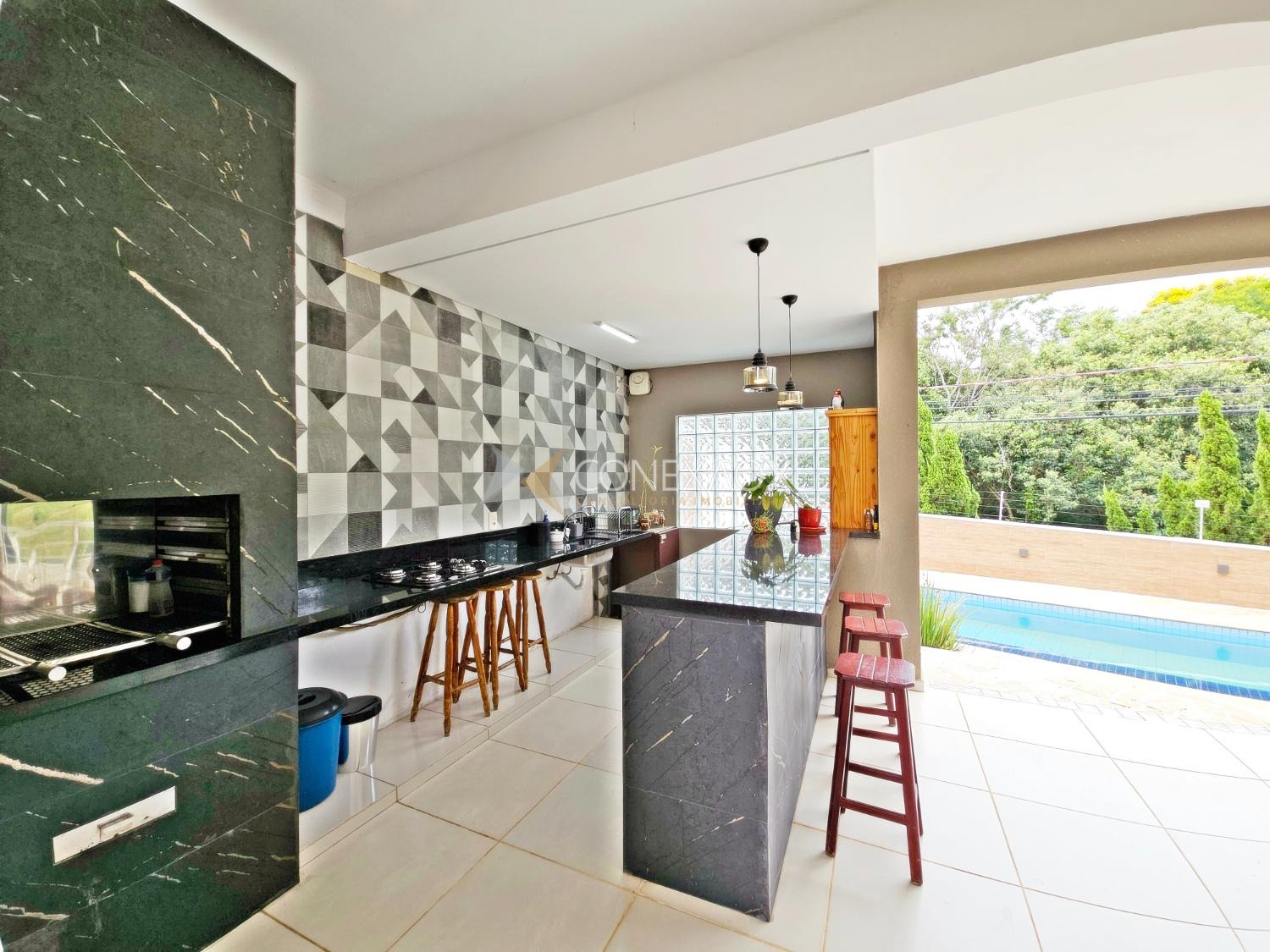 Lazer Privativo: Área gourmet com churrasqueira, piscina e um belo projeto de paisagismo no quintal.