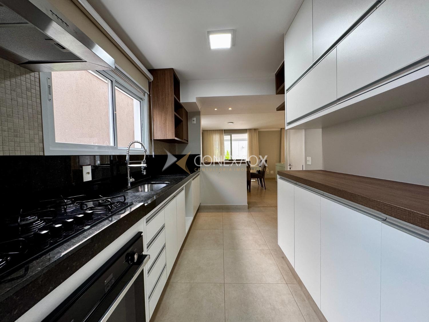 O living amplo para dois ambientes proporciona excelente iluminação natural, além de lavabo, cozinha planejada equipada com cooktop e forno embutido.