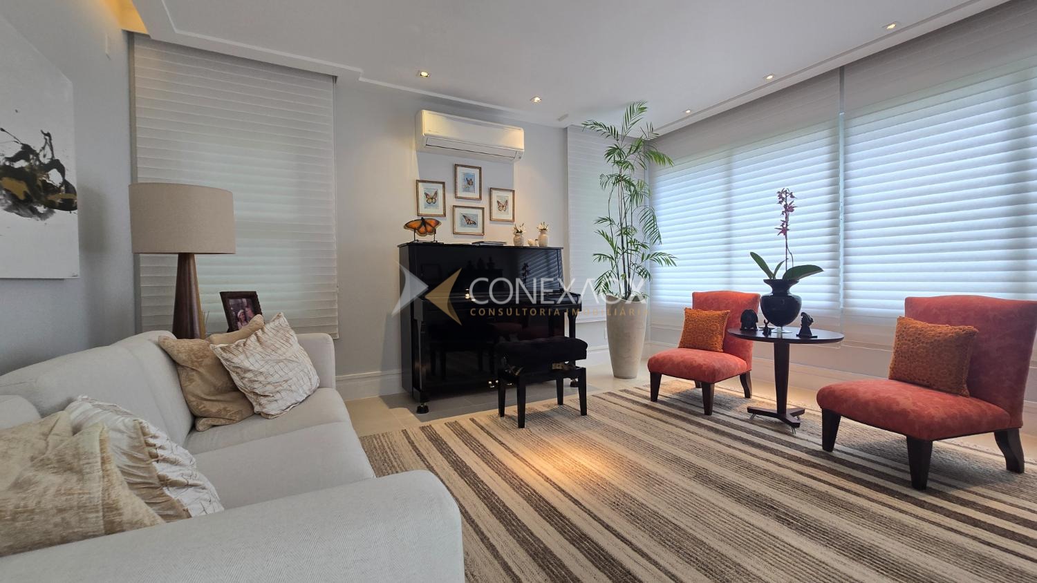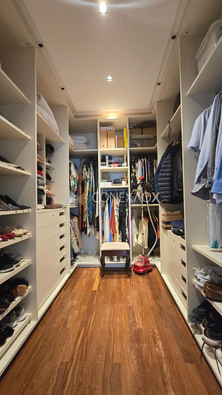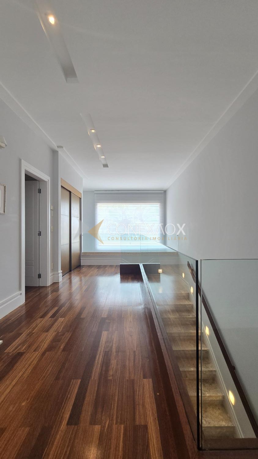 Piso superior com 4 suítes climatizadas, todas com closet, piso Indusparquet e persianas automatizadas. Suíte master com sacada, hidromassagem e cuba dupla.