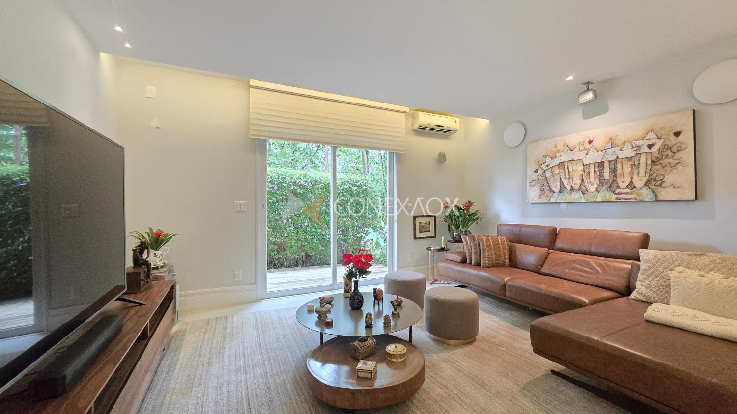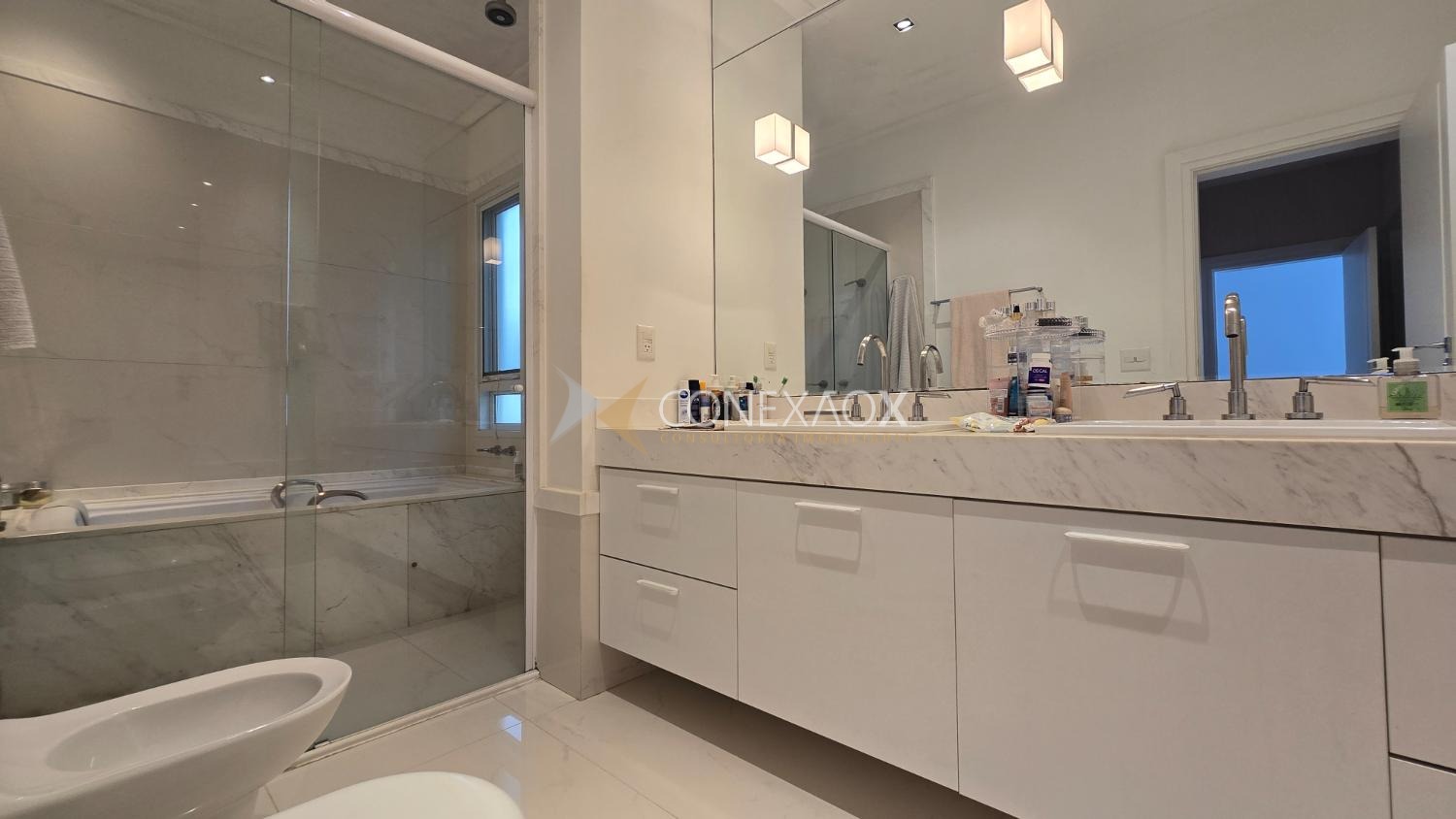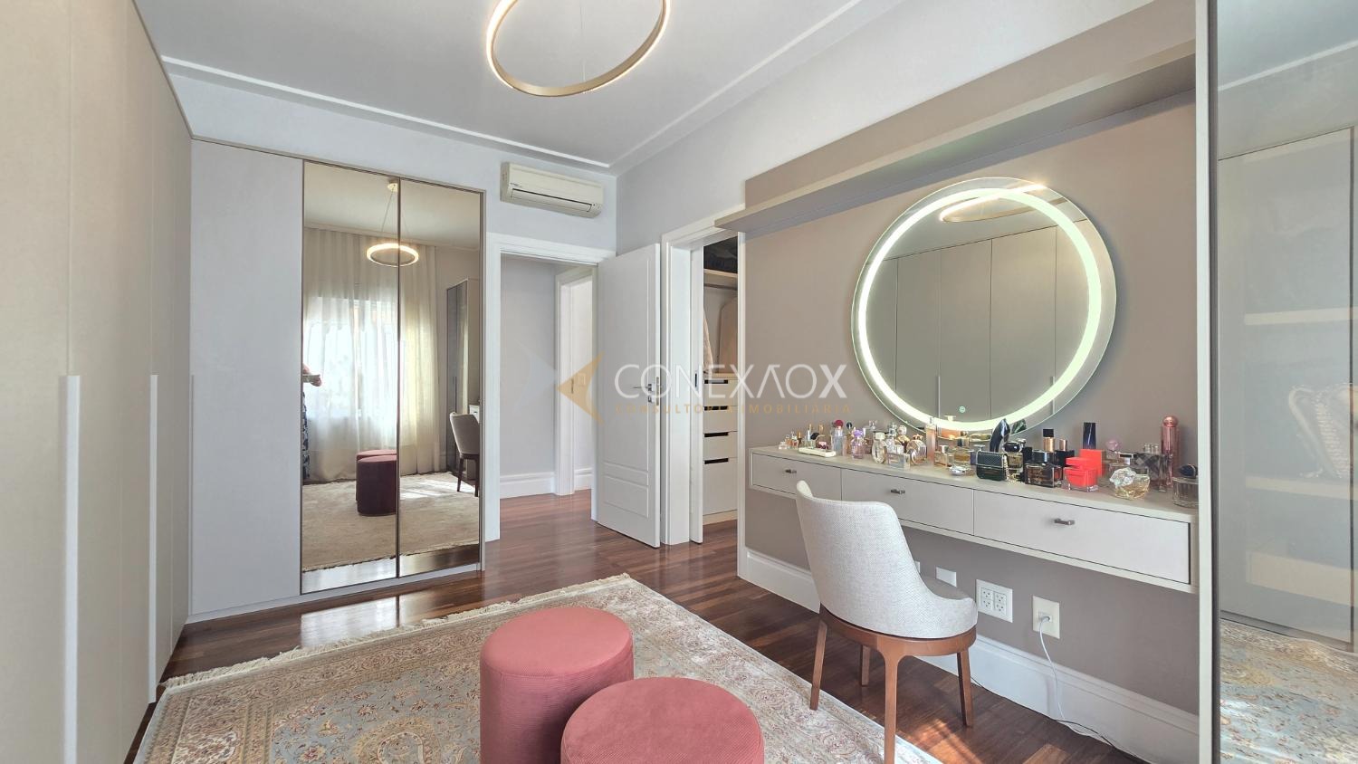 Piso superior com 4 suítes climatizadas, todas com closet, piso Indusparquet e persianas automatizadas. Suíte master com sacada, hidromassagem e cuba dupla.