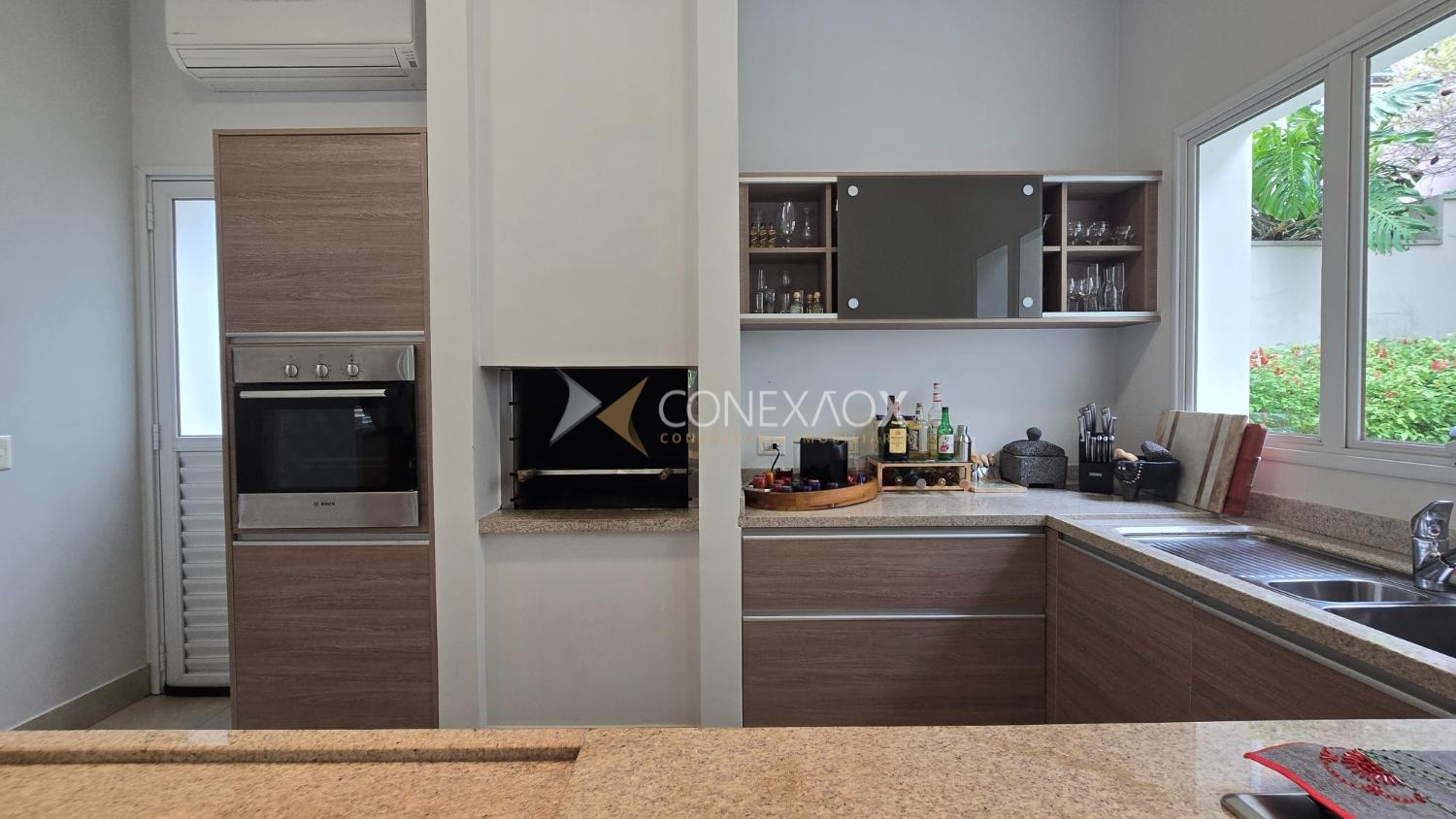 Área gourmet com churrasqueira, piscina aquecida, banheiro de apoio e despensa.