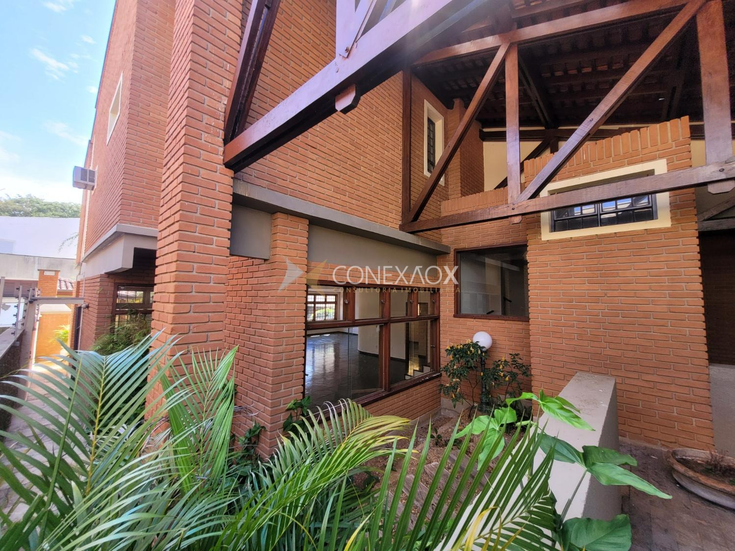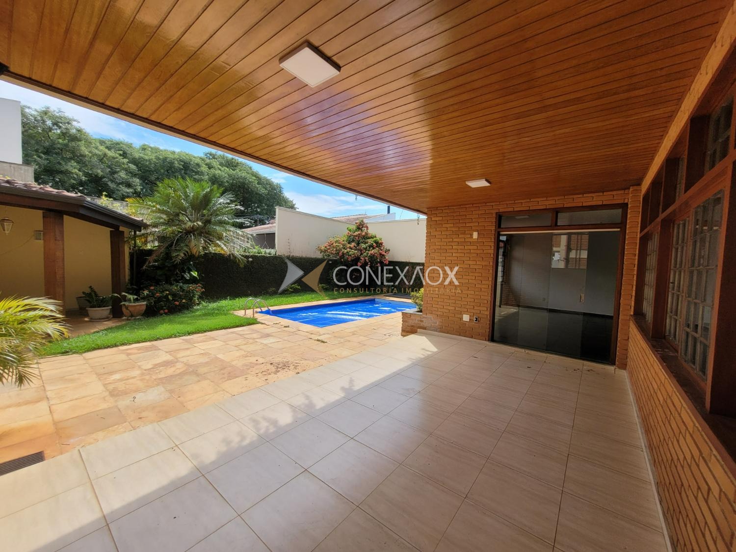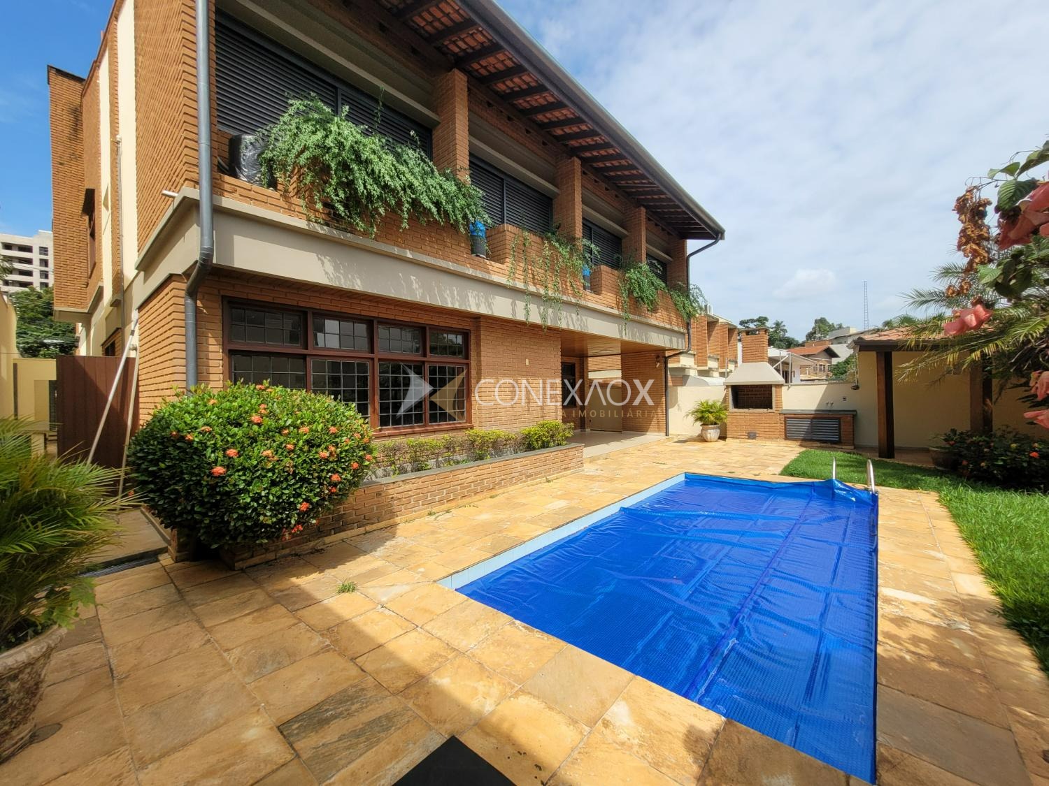 A residência possui 441 m² de área construída em terreno de 532 m², com ambientes amplos e bem distribuídos. Destaque para a sala principal com cerca de 100 m² e lareira, além de área externa com piscina, churrasqueira e dependência de funcionário, mantendo o estilo clássico com tijolos aparentes e grandes janelas que favorecem a iluminação natural.