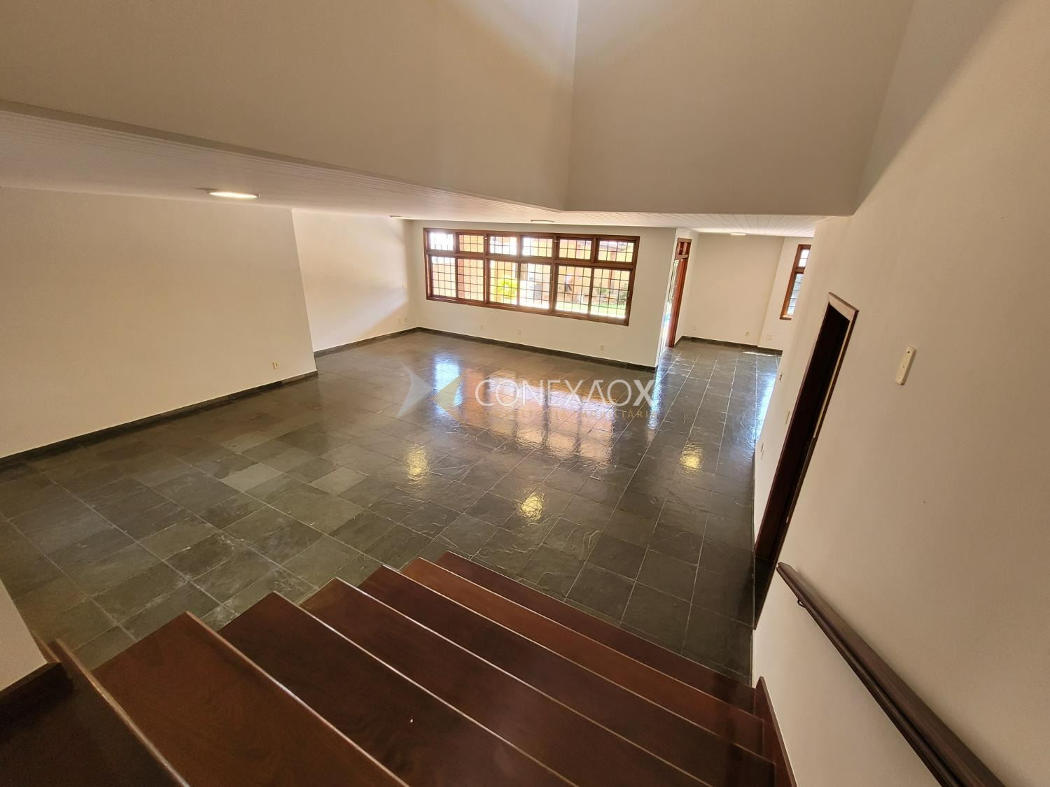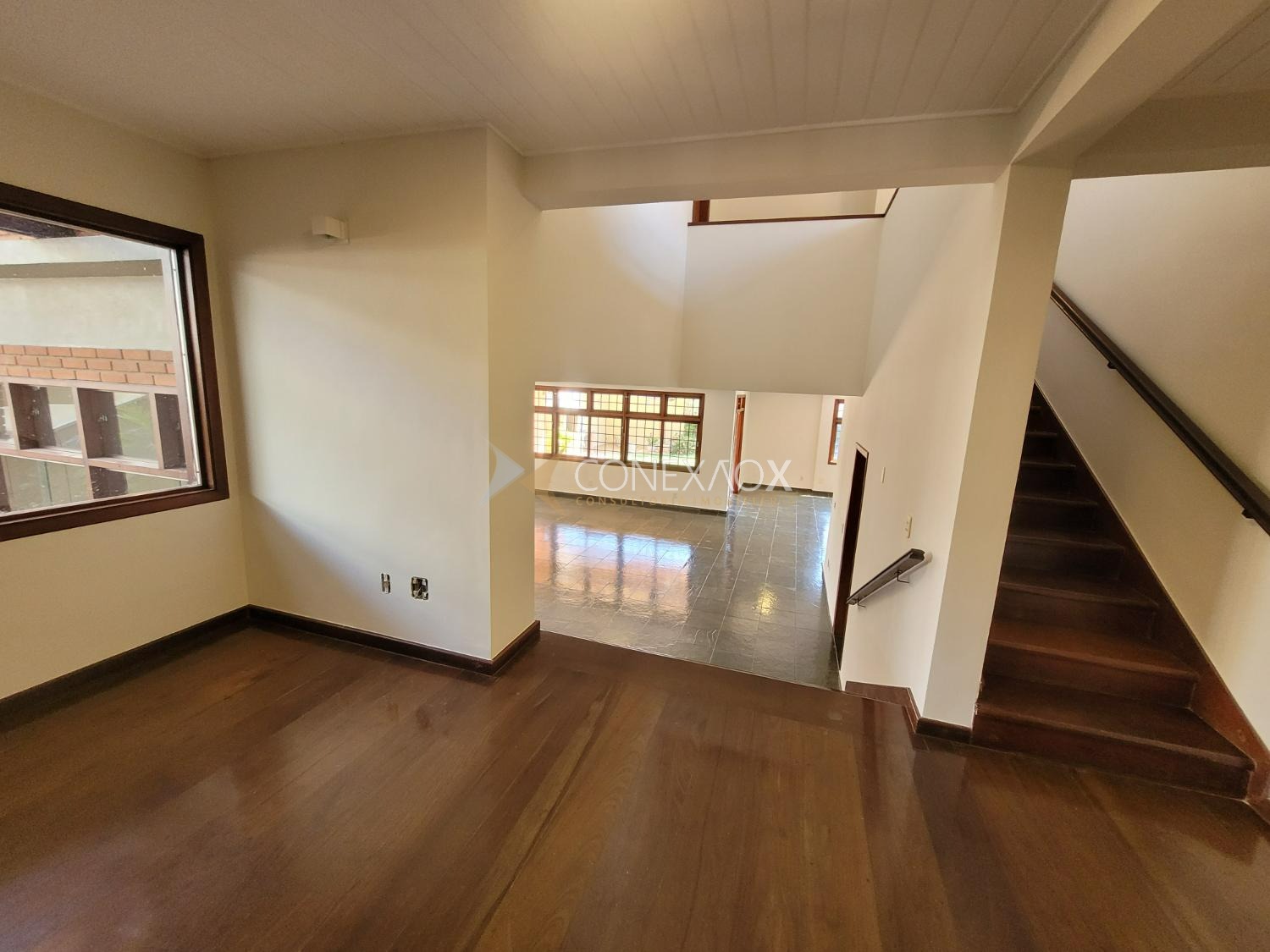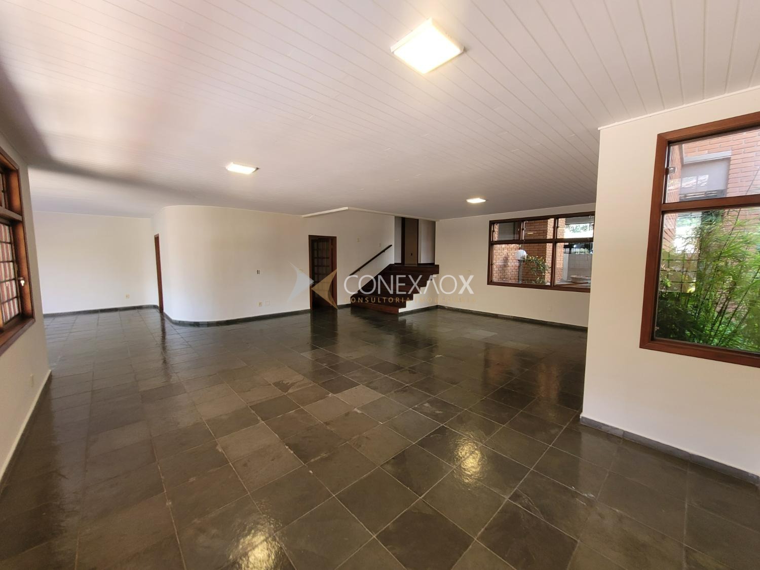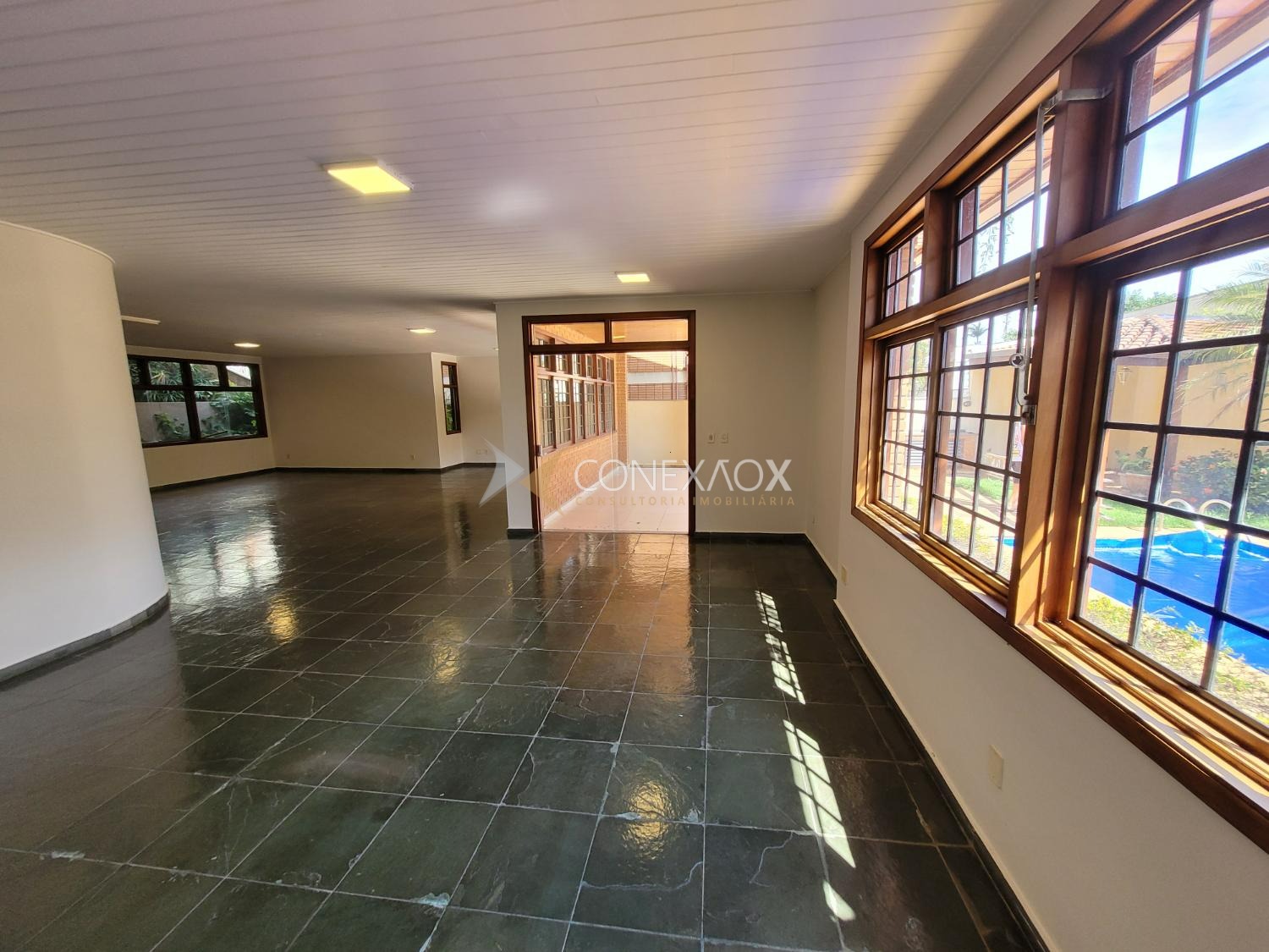 A residência possui 441 m² de área construída em terreno de 532 m², com ambientes amplos e bem distribuídos. Destaque para a sala principal com cerca de 100 m² e lareira, além de área externa com piscina, churrasqueira e dependência de funcionário, mantendo o estilo clássico com tijolos aparentes e grandes janelas que favorecem a iluminação natural.
