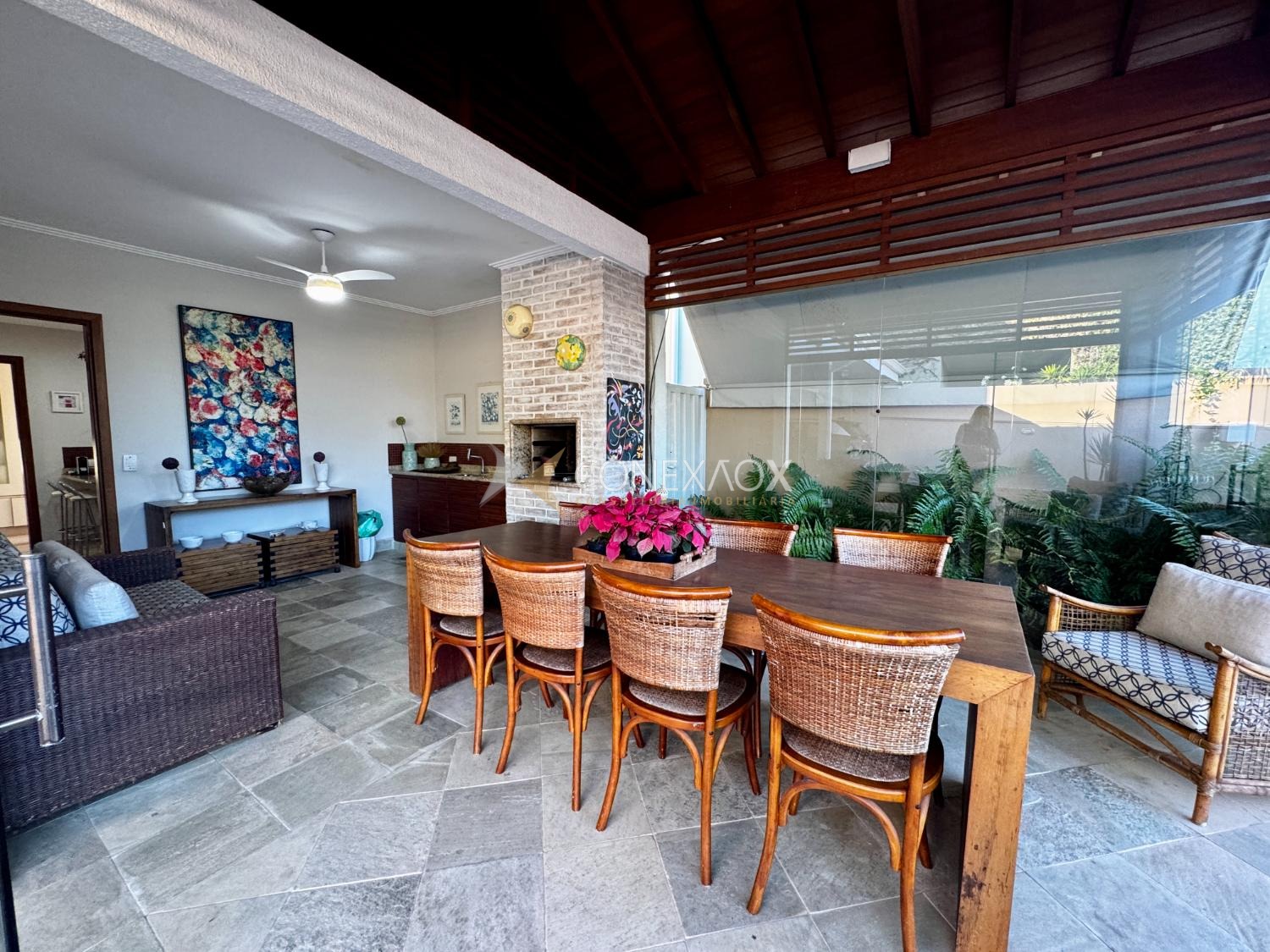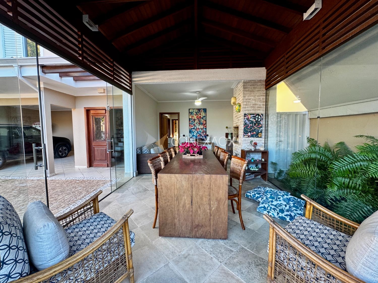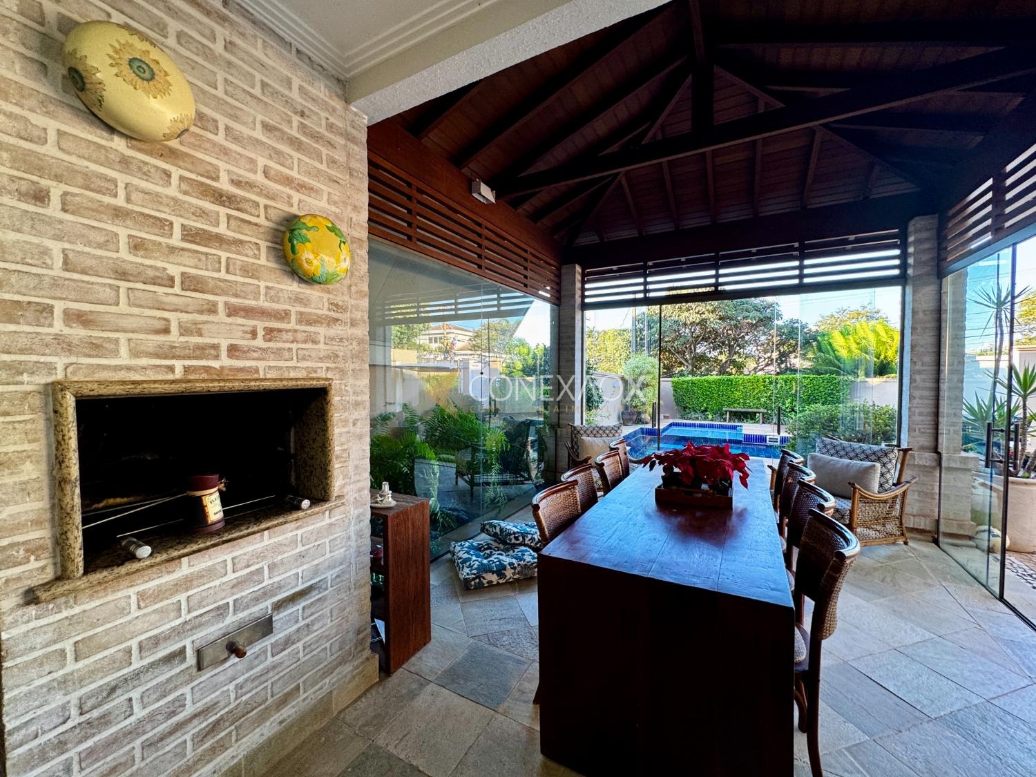 Com 287,59 m² de área construída, esta residência oferece ambientes amplos e bem distribuídos: sala para 3 ambientes com bar e lareira, lavabo e integração com área externa com paisagismo. A cozinha planejada se conecta à varanda gourmet com churrasqueira, perfeita para receber amigos e família.