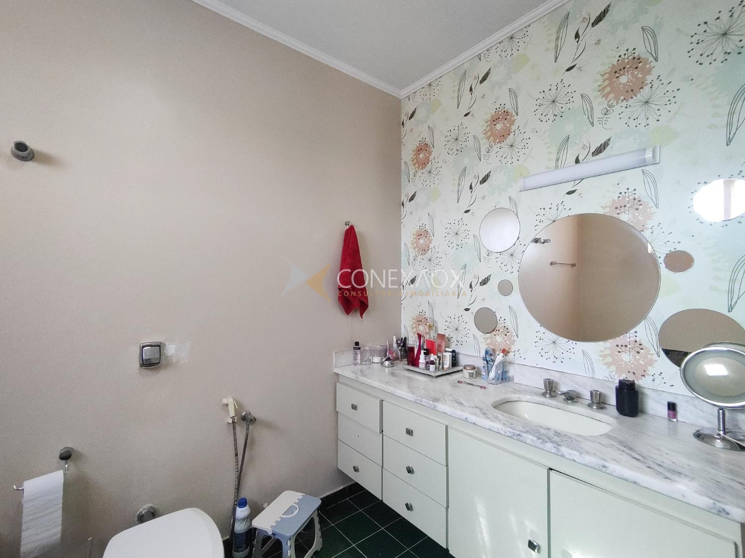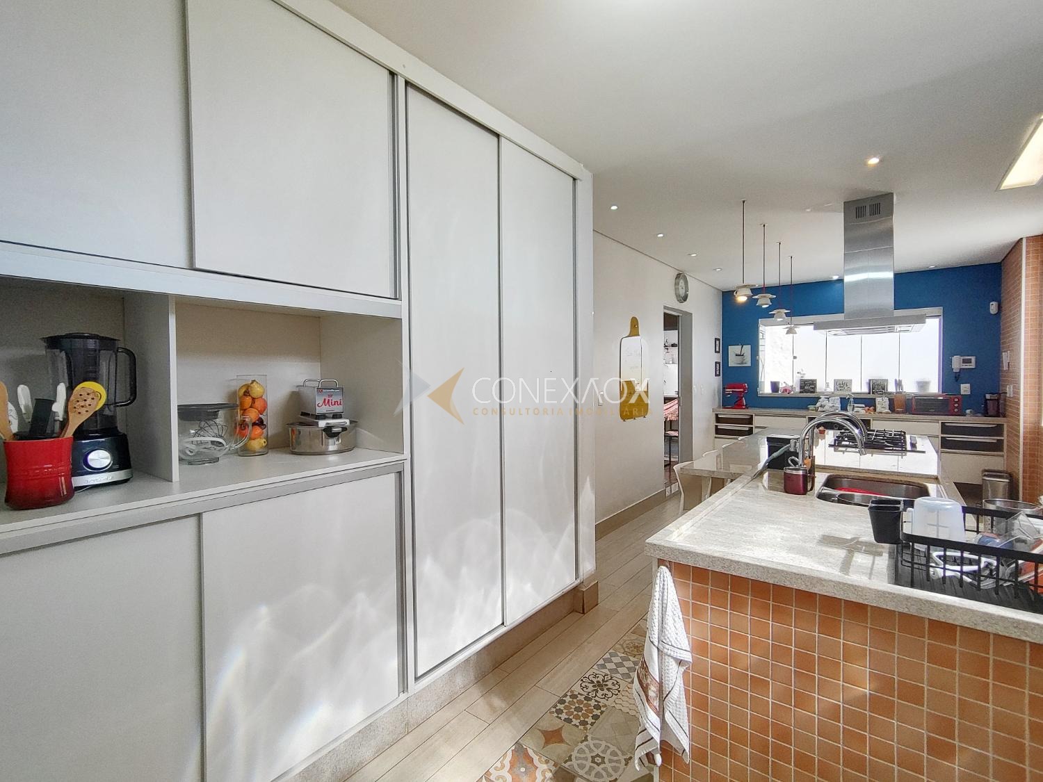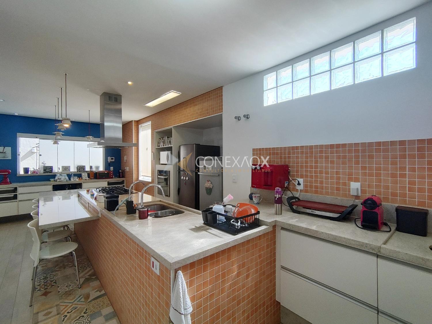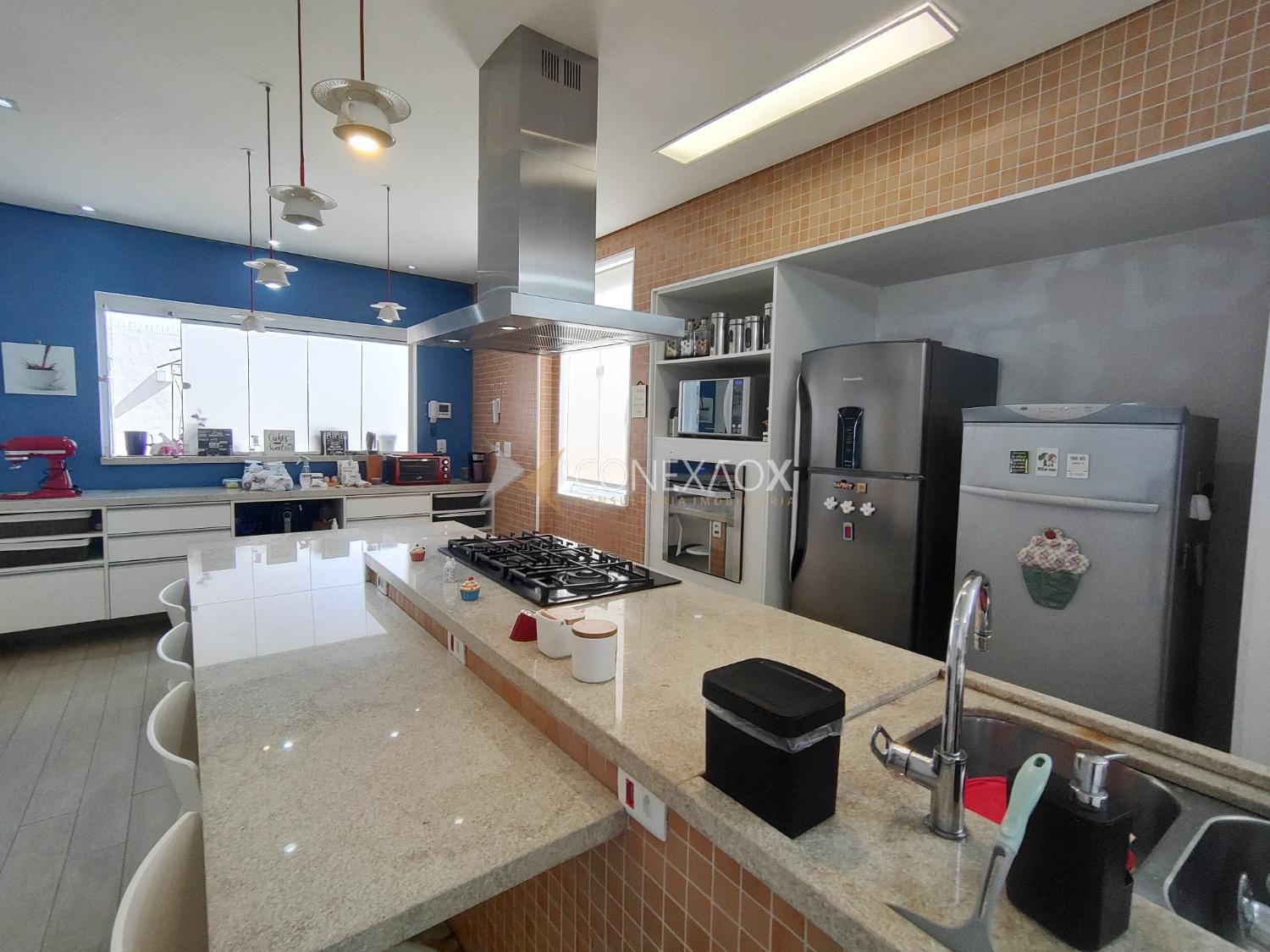 Piso térreo: hall de entrada, lavabo, 1 escritório com armários e saída para ampla área de luz, sala 3 estar/jantar/tv, 1 quartinho com banheiro e armário. Cozinha atualizada e planejada com ilha, fogão cooktop e coifa, luminárias e ar condicionado, espaço gourmet com churrasqueira e um amplo quintal (cabe piscina), área de serviço ampla.