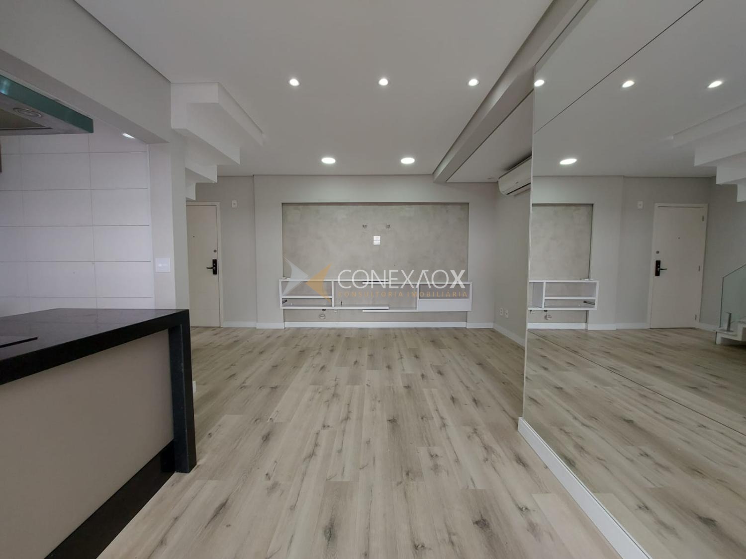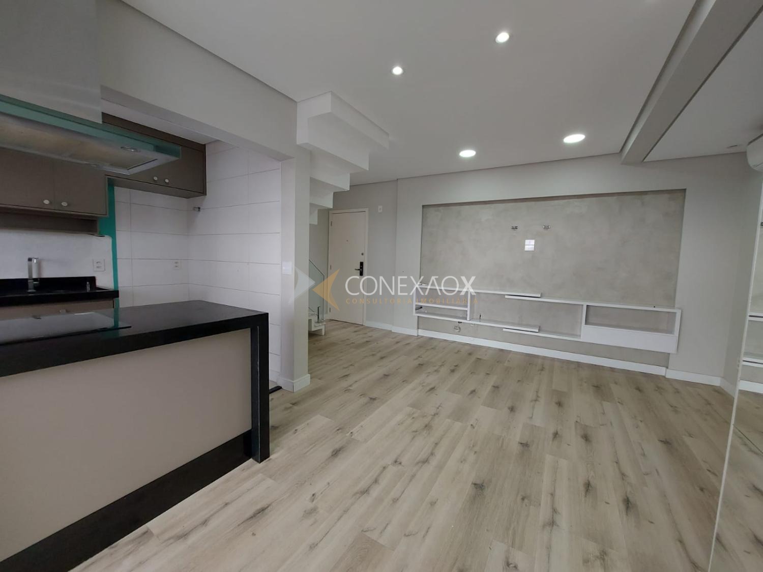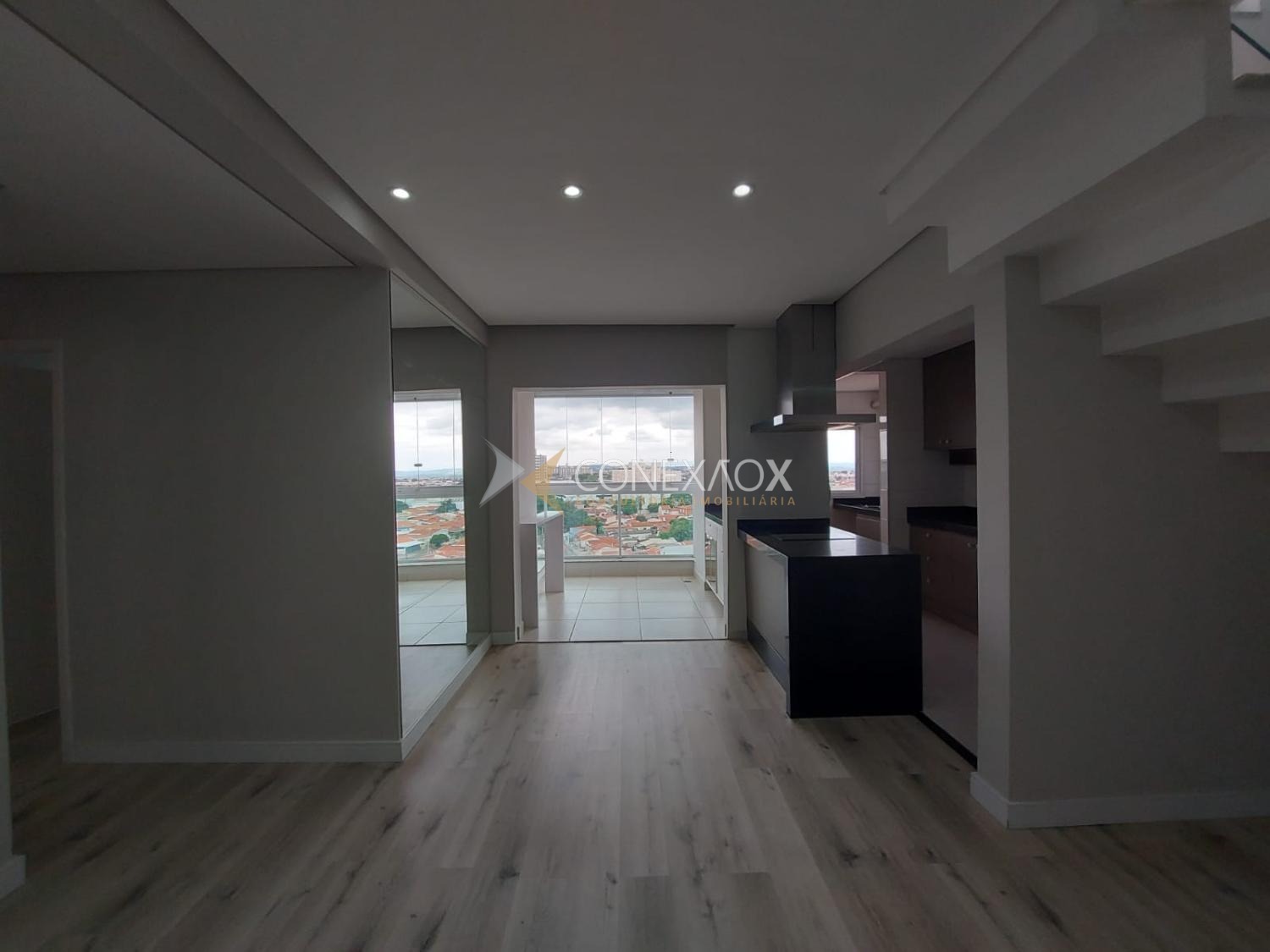 No pavimento inferior, o apartamento conta com sala para 2 ambientes climatizada, com vista incrível, integrada à cozinha planejada e equipada com cooktop e forno, além de lavanderia. São 3 quartos com armários planejados, sendo 2 suítes e mais 1 banheiro social.