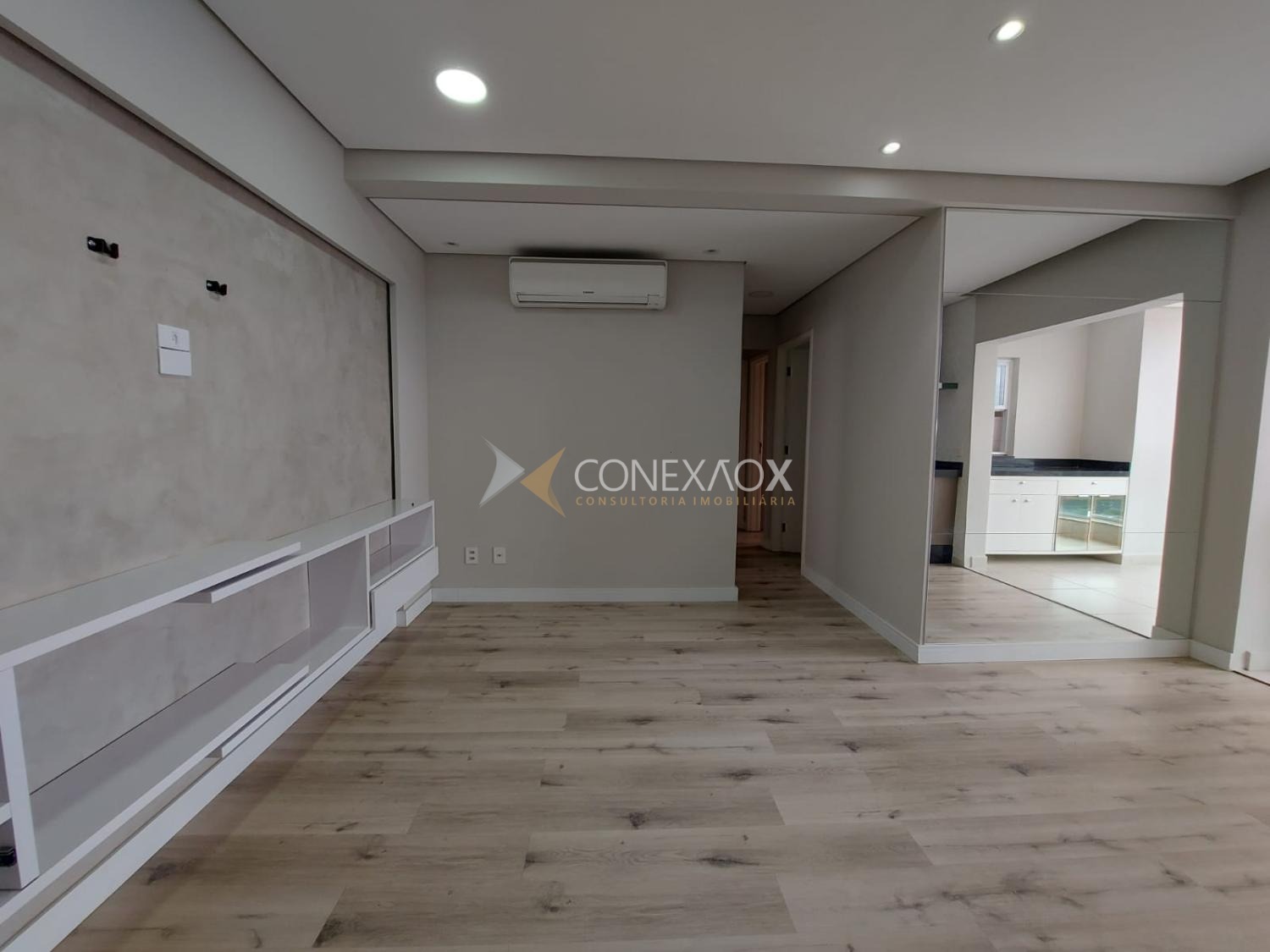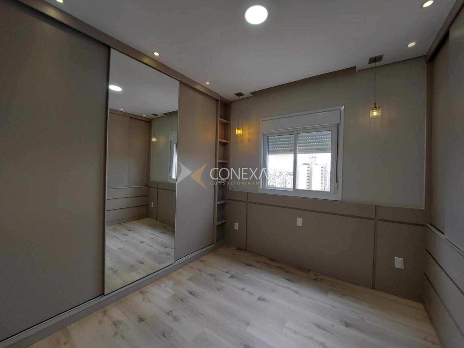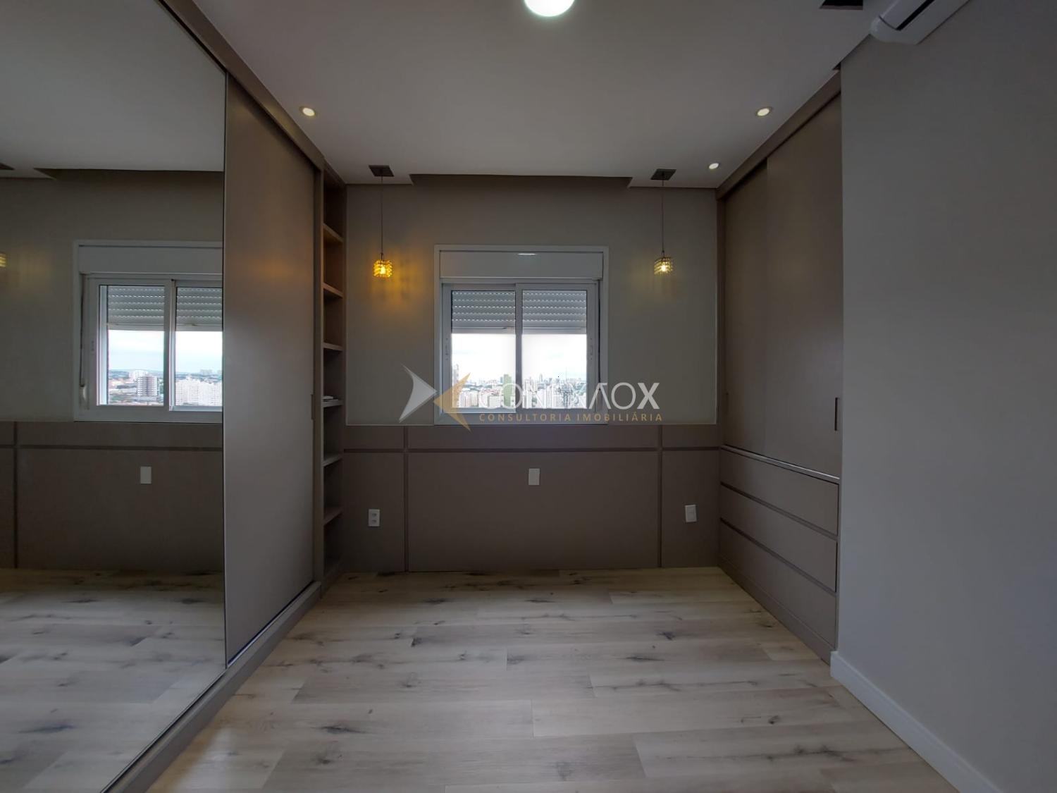 No pavimento inferior, o apartamento conta com sala para 2 ambientes climatizada, com vista incrível, integrada à cozinha planejada e equipada com cooktop e forno, além de lavanderia. São 3 quartos com armários planejados, sendo 2 suítes e mais 1 banheiro social.